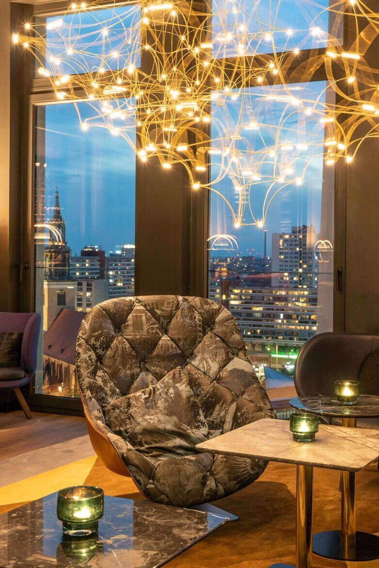 DESIGNET: Ordet sky i Rooftop One Bar fortolkes her både i oprindelig og overført betydning: på den ene side som datalagringsmediet Skyen, og på den anden side som himmelsk udsigtsplatform med udsigt over hele den bayriske hovedstad. Her danser binære koder henover væggene, mens den 360 graders panoramaudsigt over Münchens tage og helt til alperne kan nydes fra en behagelig lænestol - både indendørs og fra tagterrassen.