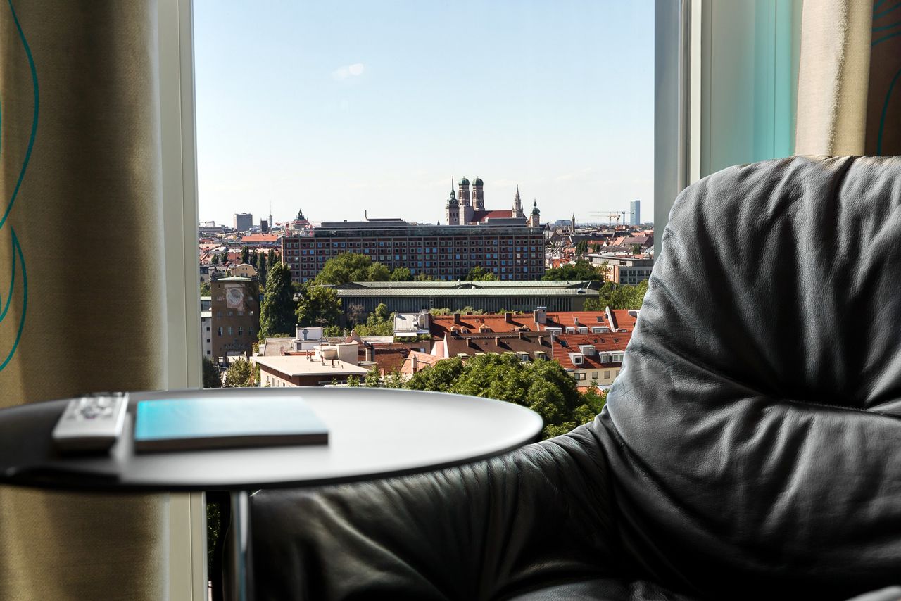 Panoramavinduets synsfelt domineres af Frauenkirkens to berømte løgkuppeltårne. Til højre for tårnene ses byens rådhus, på hvis balkon fodboldheltene fra FC Bayern München gerne lader sig hylde. Og til venstre for Frauenkirken får du øje på "Alter Peter", Peterskirkens 91 meter høje tårn. Byens anden bedste udsigtsplads – næst efter dit hotelværelse altså!