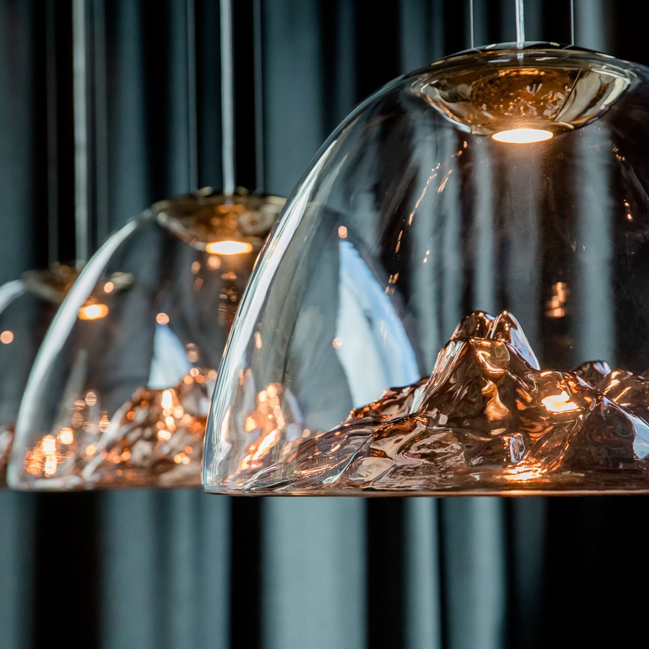 Gemütlich - ja, angestaubt - nein! Um den alpinen Charakter zeitgemäß zu interpretieren, finden sich genügend moderne Details, wie diese Pendelleuchten mit eingebauten Bergsilhouetten von Axolight, die das Interior-Thema ausbalancieren.