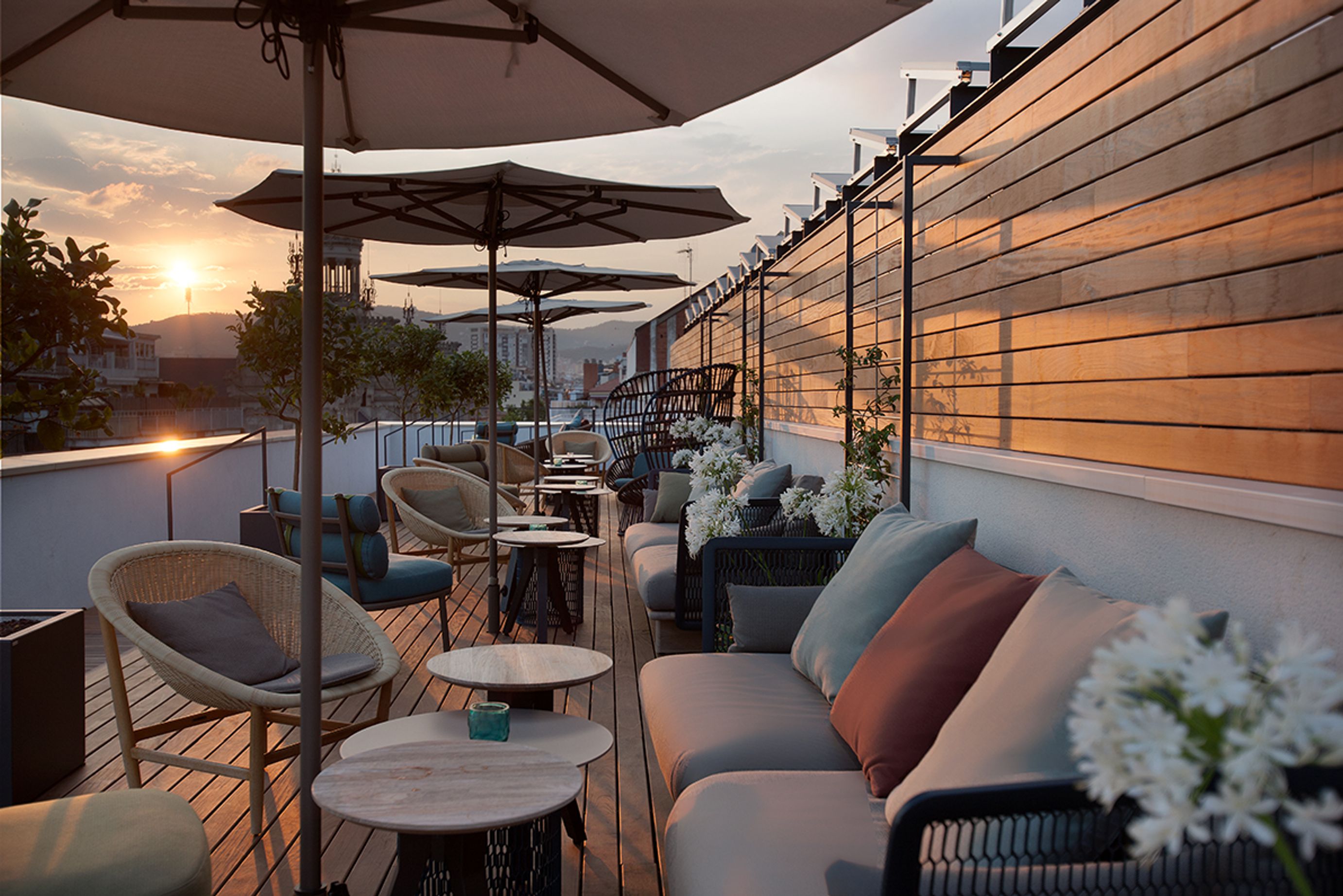 . Bei einer Ausstellung in der renommierten - dort stellte damals schon Picasso aus - wurden unsere Innenarchitekten auf Anais aufmerksam. Ihr für unser Hotel angefertigtes Werk „Peya“ besteht aus Papier, verschiedenen Metallgeweben und Metallfolie. Der Phantasie sind keine Grenzen gesetzt, wenn man die schwebenden Blätter, Blütenformen und Verästelungen betrachtet – und sich das Kunstwerk als Schatten an den Wänden und als Spiegelbild in der hohen Fensterfront schwerelos fortsetzt.Sie hätten es gerne noch luftiger? Na, dann hinauf mit Ihnen auf unsere Rooftop-Bar. Hier können Sie über die Dächer Barcelonas bis hin zum Meer sehen… und dabei mit einem Gläschen spanischen Wermut auf die Aussicht, das Leben und was Ihnen sonst noch so einfällt, anstoßen: