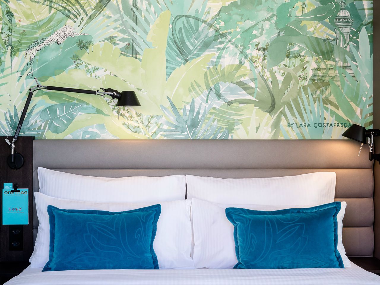 Eine grüne Ruhe-Oase erwartet Sie auch in Ihrem Zimmer. Mit Wandillustrationen am Kopfende der Boxspringbetten transportiert Lara Costafreda Dschungelfeeling in Ihre Komfortzone – mit entspannendem Nebeneffekt: Grüntöne beruhigen und sorgen für erfrischenden Schlaf!
