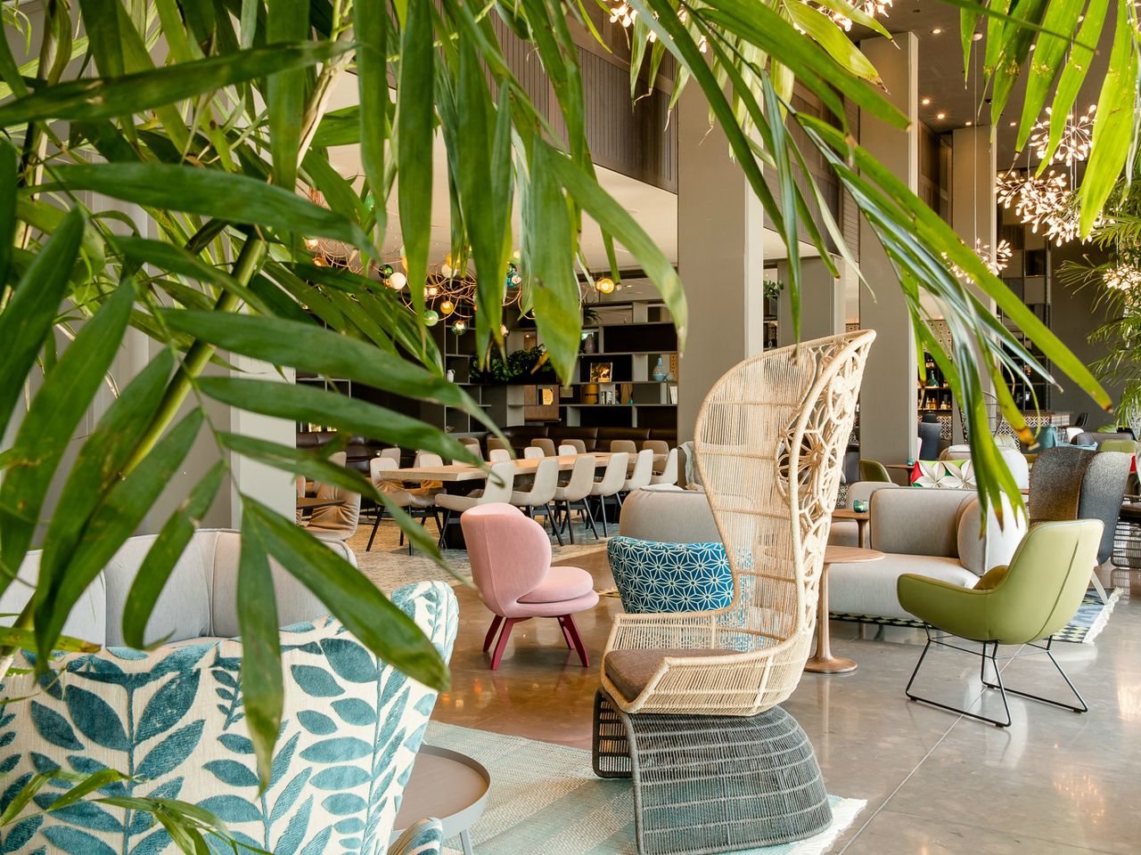 inspirierte der Park zu ihrer Tapete in luftig-leichter Aquarelltechnik, die die Rückwand der Rezeption ziert. Neben Pflanzen und Tieren fängt sie auch architektonische Elemente des Parks mit Brunnen, Säulen und Laternen ein – manche noch Überbleibsel der Weltausstellung von 1888.Unterstrichen wird die grüne Design-Welle von -Pendelleuchten, die an Blumensträuße erinnern, unseren klassischen Egg Chair in frischen Botanikprints und kunstvoll blühenden Flechtsesseln der Designerin . Schon sind Sie mittendrin im (Großstadt-)Dschungel. Pssst, haben Sie da hinten auch etwas rascheln gehört…?