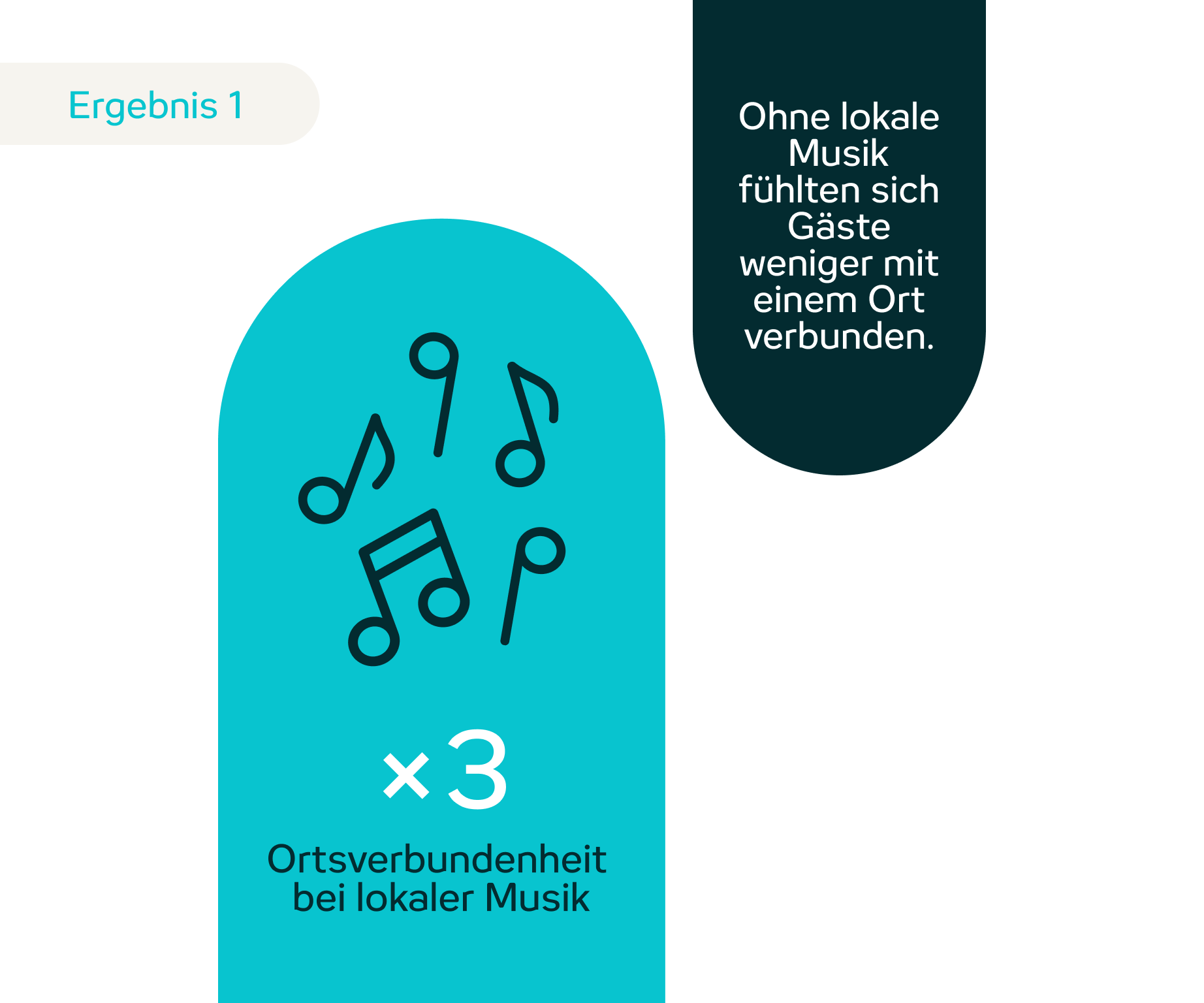 Gäste, die lokale Playlists hörten, fühlten sich fast dreimal so wahrscheinlich mit dem Aufenthaltsort verbunden wie Gäste mit nicht-lokalen Playlists. Lokale Musik verstärkt damit das Gefühl des Ankommens messbar.