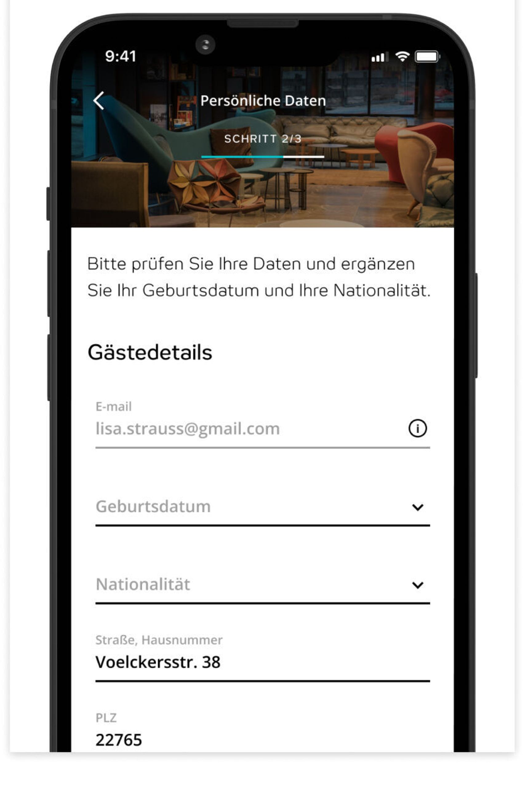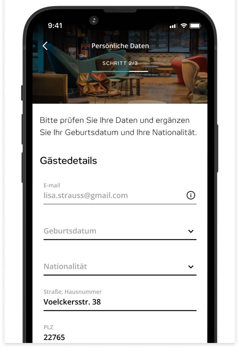 Die Daten sind aus der Buchung und deinem beOne-Profil vorausgefüllt. Du musst nur noch wenige Angaben ergänzen.