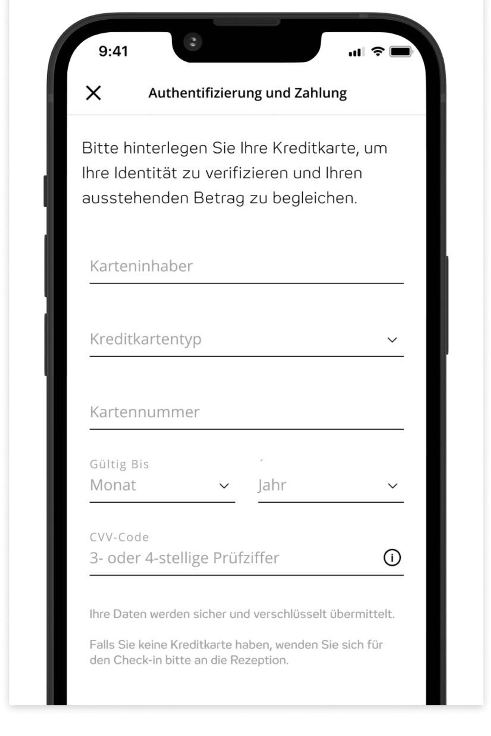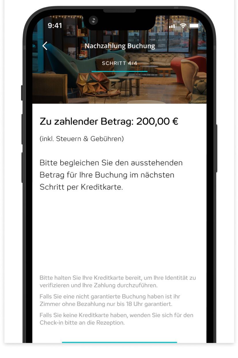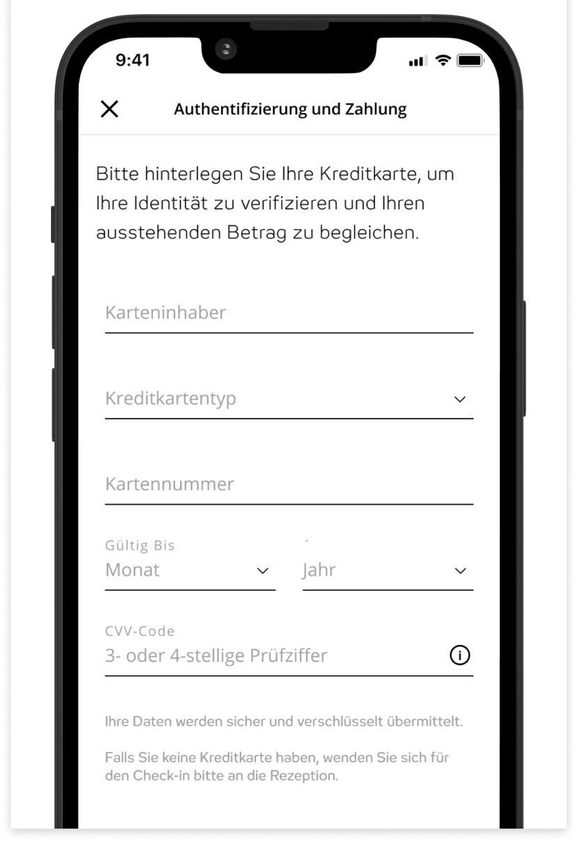 Sofern du deinen Aufenthalt noch nicht bezahlt hast, kannst du offene Rechnungen mit deiner Kreditkarte begleichen.
