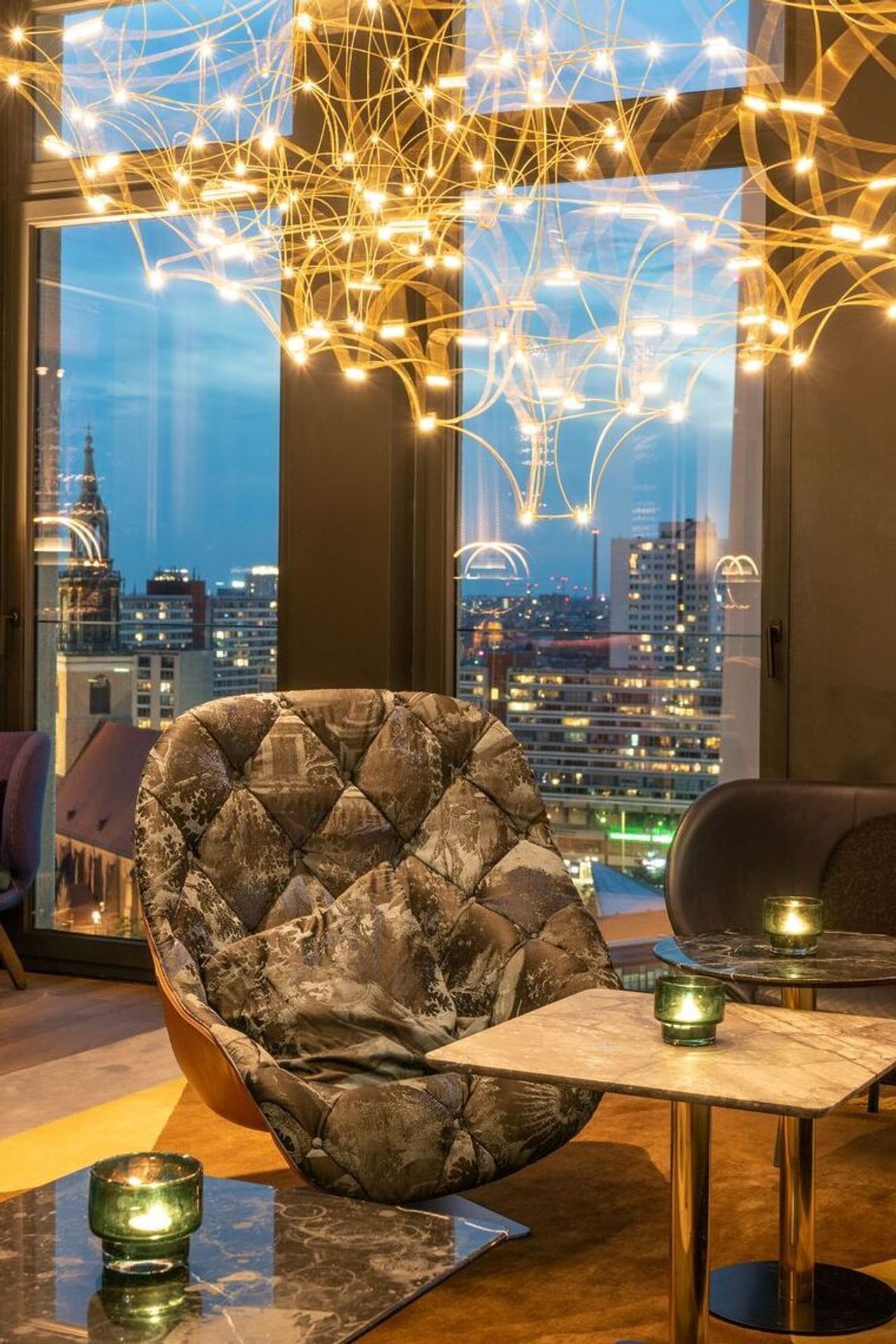 DAS DESIGN: Die Bedeutung der Wolke – oder eben „Cloud“ – wird in dieser Rooftop One Bar gleich doppelt aufgegriffen: als Datenspeicher und als himmlischer Aussichtspunkt über München. Hier läuft daher Binärcode über die Wände, während sich in gemütlichen Sesseln der 360-Grad-Rundumblick über München bis in die Berge genießen lässt – innen und auch auf einer Außenterrasse.
