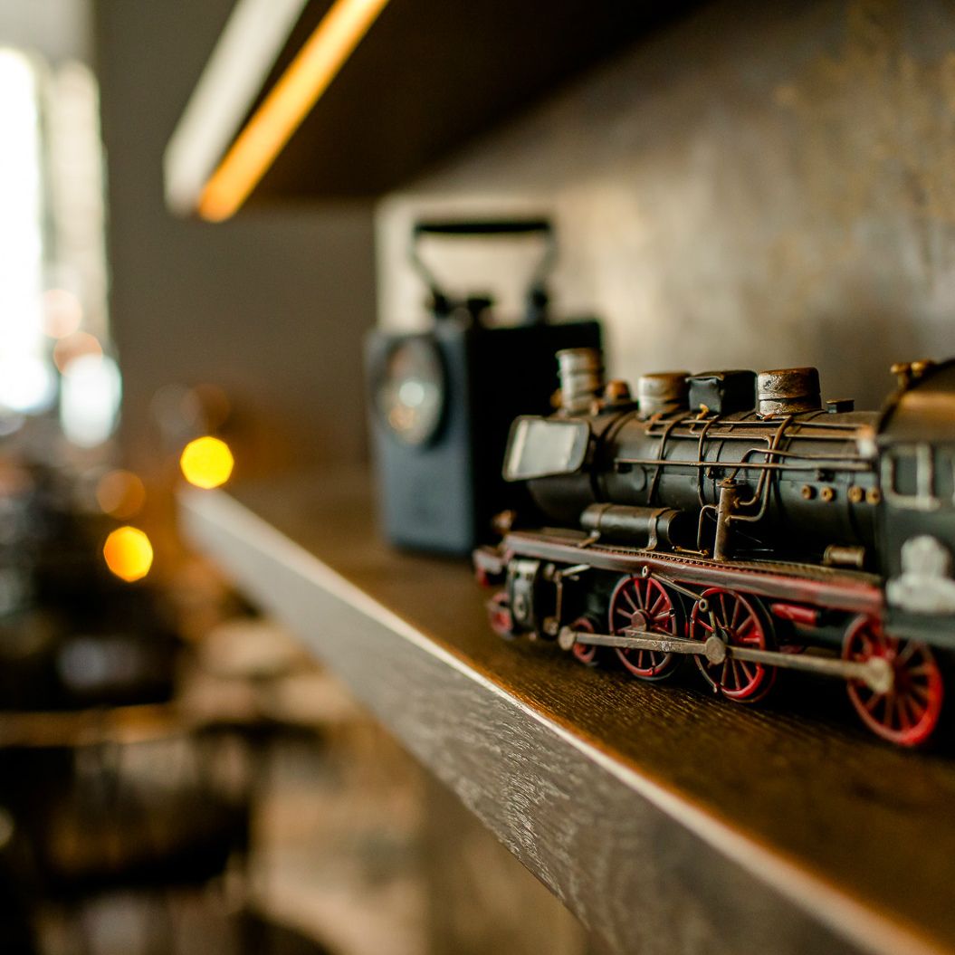Reisen macht ja bekanntlich hungrig – deshalb sollten Sie sich unbedingt noch vor Aufbruch ins Abenteuer beim Frühstück stärken. Ihren „Breakfast Tea“ können Sie in wohliger Atmosphäre mit Holzvertäfelung genießen. Ganz ohne Gleis-Geruckel versteht sich! Dafür stellen Stahlregale bestückt mit Hutschachteln und Ferngläsern sowie Sessel der Manufakturen Erik Joergensen und Freifrau, deren Anordnung an typische Wagon-Bestuhlung erinnert, die Weichen für eine charmante Kombi zwischen Reiseromantik und der dafür notwendigen industriellen Technik.