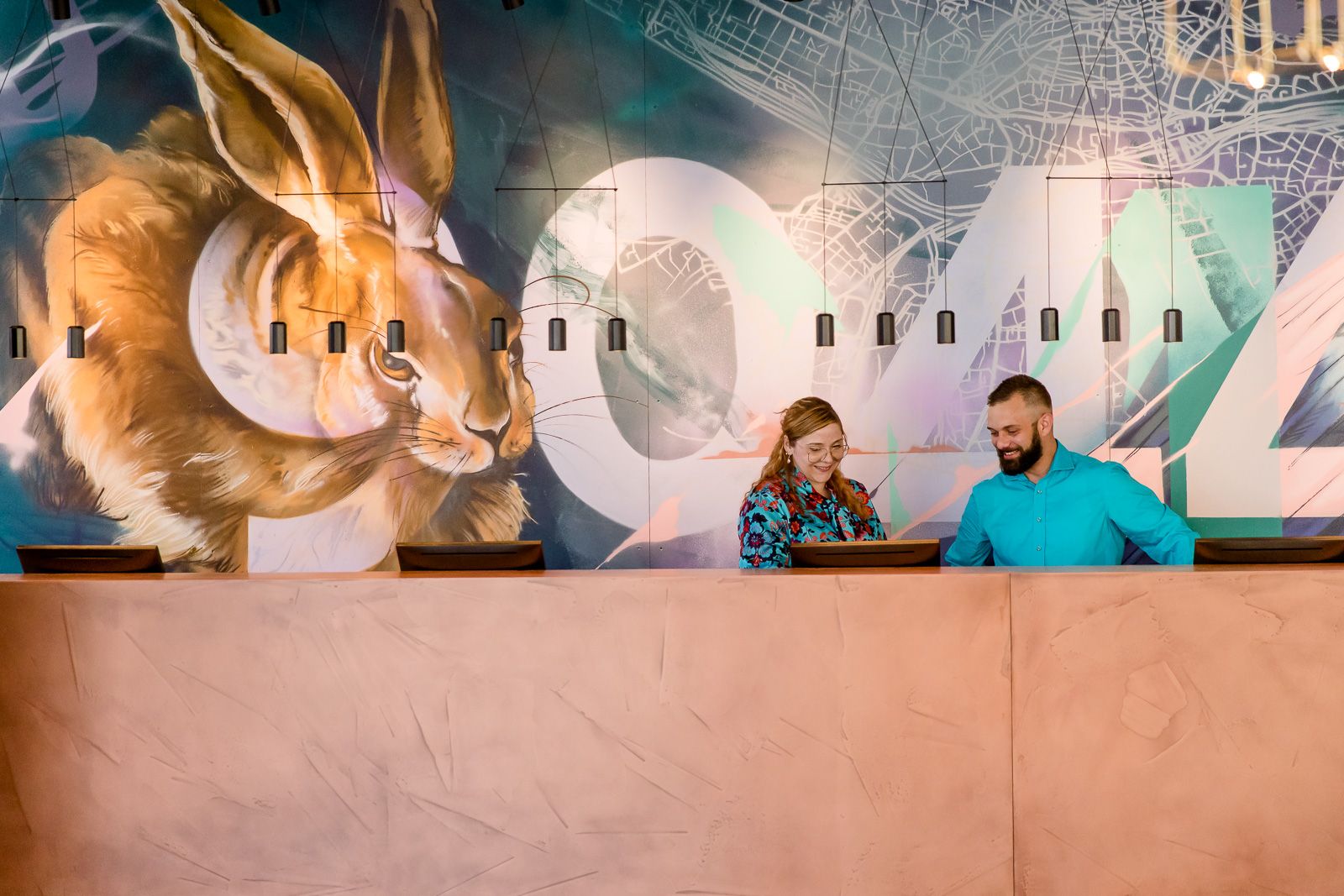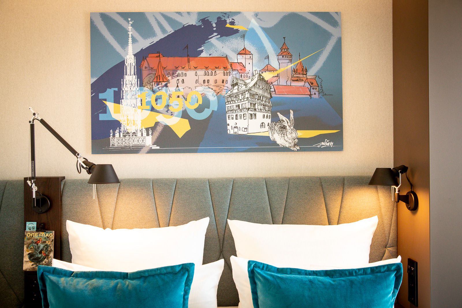 Von der Rezeption - bis zu den Zimmern: Julian Vogels Kunst zieht sich durch unser Motel One in Nürnberg. Über den Betten finden sich weitere seiner kreativen Stadt-Referenzen. Die erste Eisenbahnfahrt von 1835 oder das Gründungsjahr Nürnbergs 1050 sind genauso illustriert wie Kaiserburg, Schöner Brunnen, Dürer-Haus und... natürlich Hase. Also, hopp, hopp ins Bett!