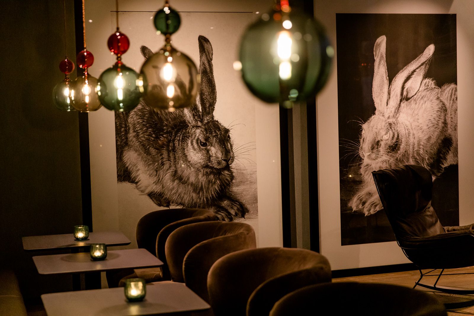 Wie auch schon an der Rezeption siehst du in der Bar, wie der Hase läuft. „Der Feldhase" von 1502 ist Dürers wohl bekannteste Naturstudie. Besonders ist die Detailgenauigkeit und Lebensechtheit, mit der er seine Motive einfing. In überdimensionalen Bilderrahmen lässt sich das scheue Tier in all seinen Einzelheiten ganz in Ruhe betrachten.