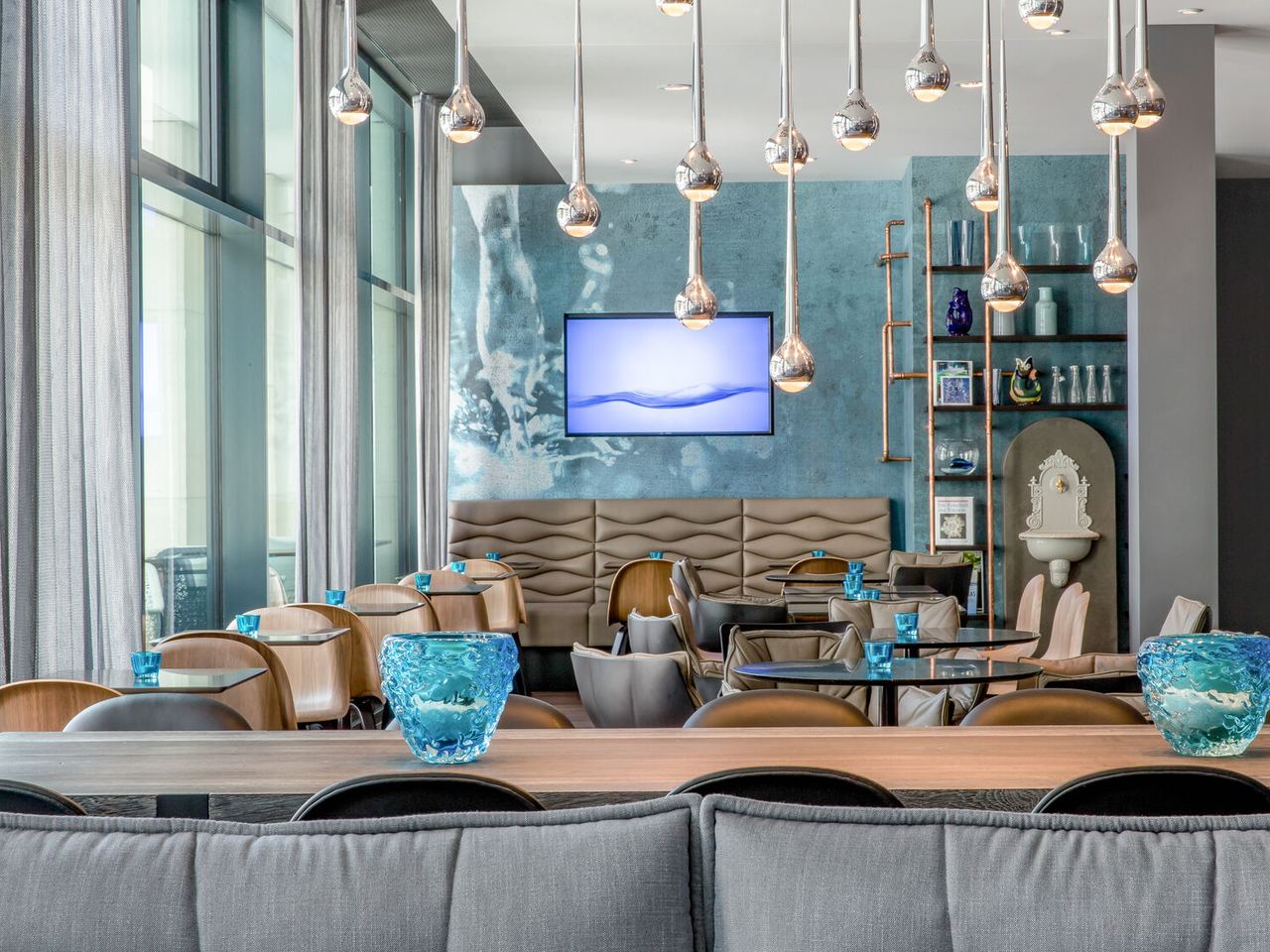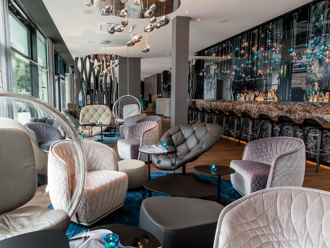 Fließende Formen und sprudelnd-frische Farben strömen auch durch unseren Barbereich. Zwischen wellenförmigen Raumtrennern, sanft schimmernden Sitzgelegenheiten und transparenten Hängesesseln, die wie Tropfen von der Decke baumeln – „Bubble Chairs“ von Eero Aarnio Originals – lässt es sich nahezu schwerelos entspannen, ganz wie in einer Unterwasserwelt. Die runden Teppiche in 3D-Optik von Christian Fischbacher simulieren die Bewegung des Wasser. Und auch die extra für Motel One konfektionierte Pendelleuchte „Mercury" von Artemide lässt an Tropfen denken. Tauche ein – ganz ohne nass zu werden.