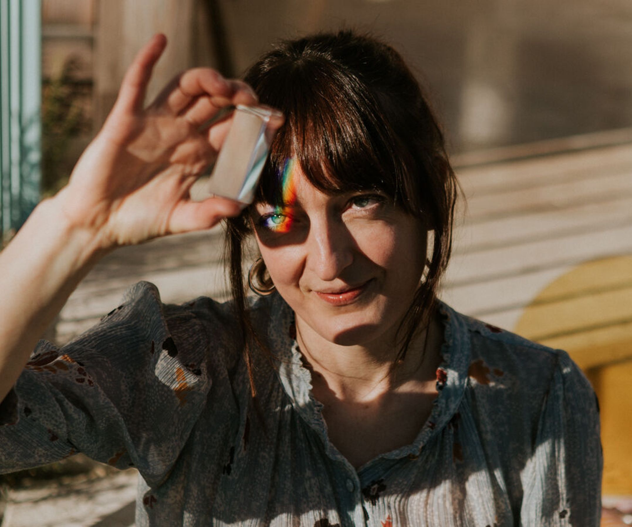 als Bildträger, glänzendes und mattes Papier für die Collagen sowie dichroitisches Glas, das Licht in wechselnden