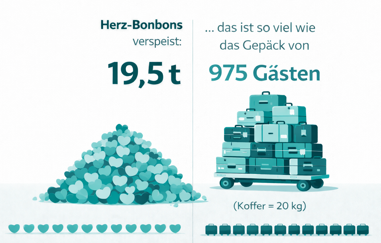Offensichtlich habt ihr ein Herz für unsere Herz-Bonbons! Ihr habt so oft zugegriffen, dass sich ganze 975 Koffer à 20 Kilogramm damit füllen ließen.