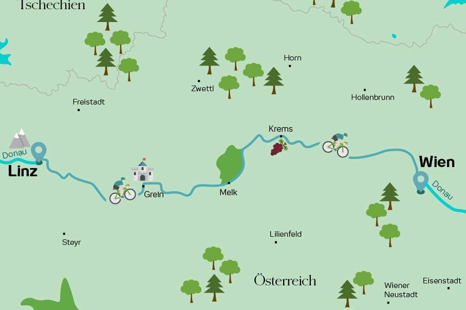 Der Donauradweg (Fernradweg D6 – Eurovelo 6) ist eine der beliebtesten Radrouten Europas und durchläuft vom Donauursprung bis an das Schwarze Meer acht europäische Länder. In Österreich führt der schönste Teil der Route von Linz nach Wien. Flussabwärts benötigt man für die etwa 220 Kilometer lange Strecke etwa 11 bis 15 Stunden reine Fahrzeit – je nach Tempo, Ausrüstung und Kondition. Die Route ist am besten in drei oder vier Tagen zurückzulegen – mit Stopps in Grein, Melk und Krems. In unseren Hotels in Linz und Wien-Prater bieten wir sichere Stellplätze für deinen Drahtesel.