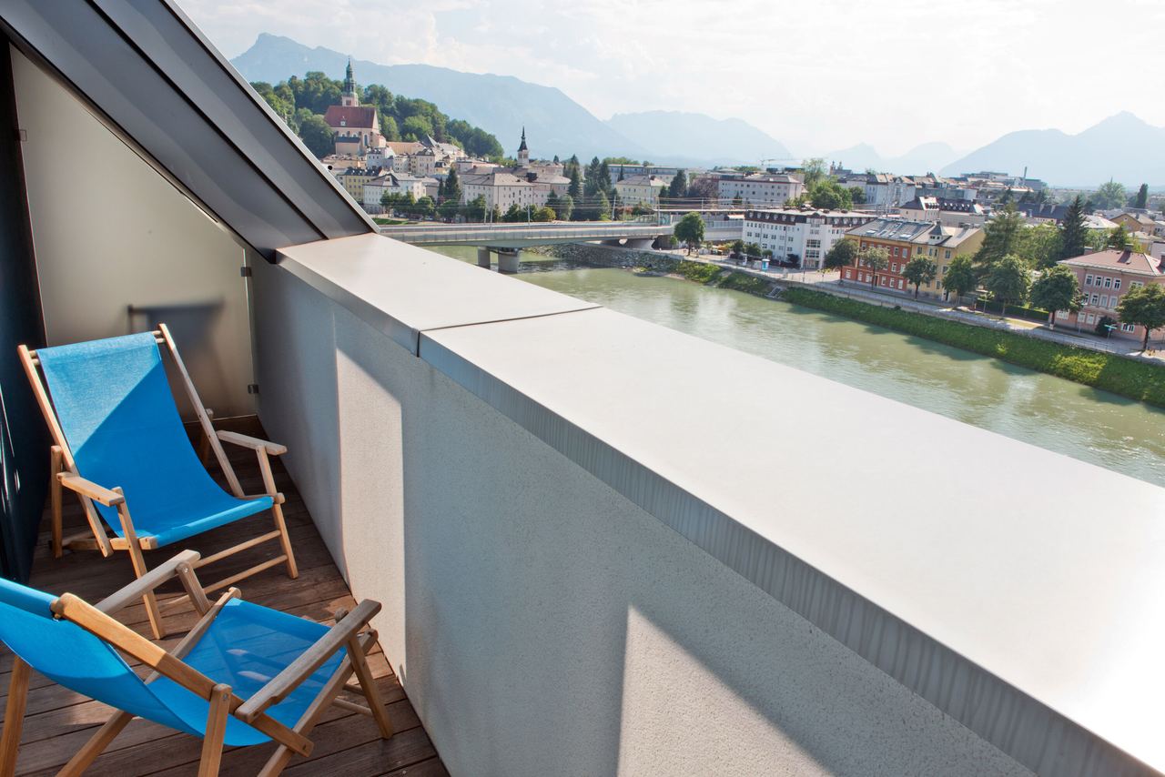 Ein wunderschöner Blick über die Salzach auf den Mönchsberg – an dessen Fuße das Große Festspielhaus liegt – und die Festung Hohensalzburg. Bei klarem Wetter eingerahmt vom eindrucksvollen Panorama des Tennengebirges im Hintergrund.