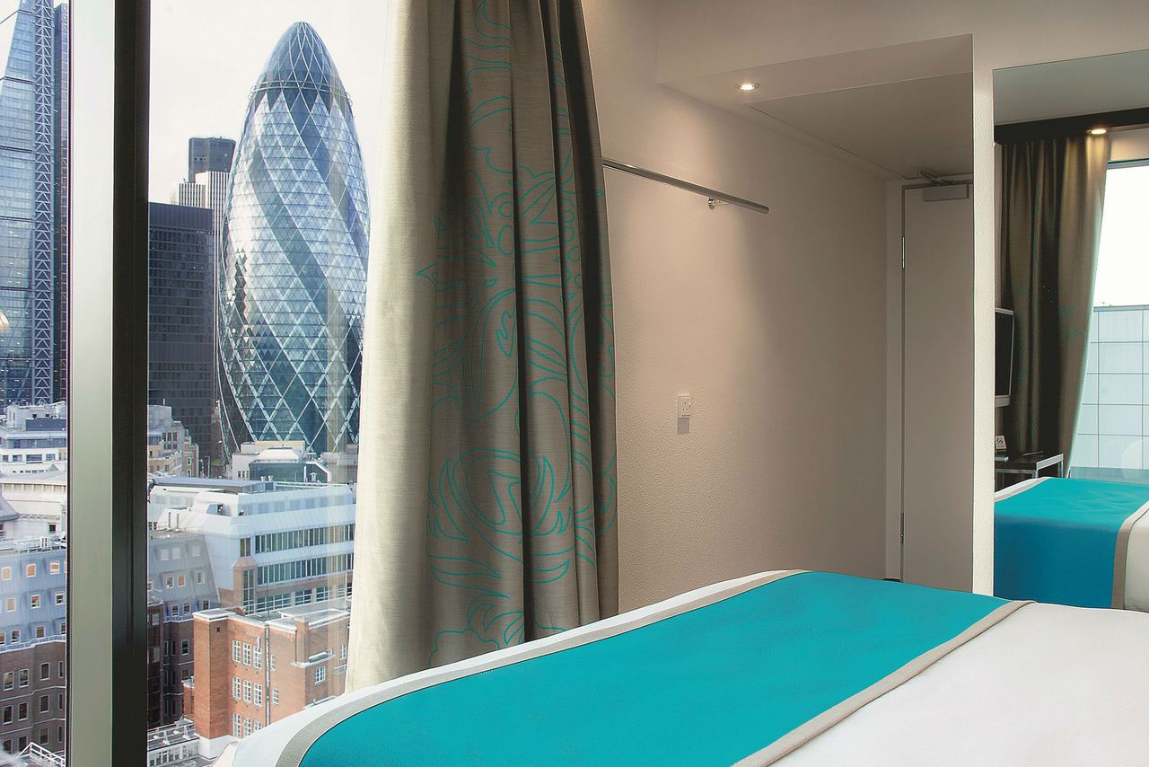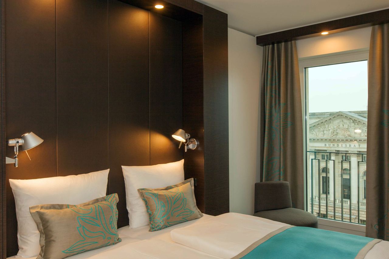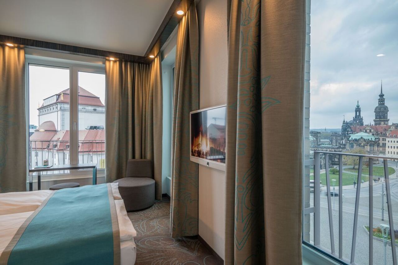 Wer in Zimmer 581 absteigt, sollte auf keinen Fall seinen Operngucker vergessen: Der Blick aus dem Fenster zeigt das Schauspielhaus Dresden. Gleich nebenan kann man den weltberühmten Zwinger mit seinen langgestreckten, barocken Galerien und dem vergoldeten Zwiebelturm erspähen. Rechts davon die Semperoper, die mit ihrer einmaligen Architektur zu den prachtvollsten Opernhäusern der Welt gehört.