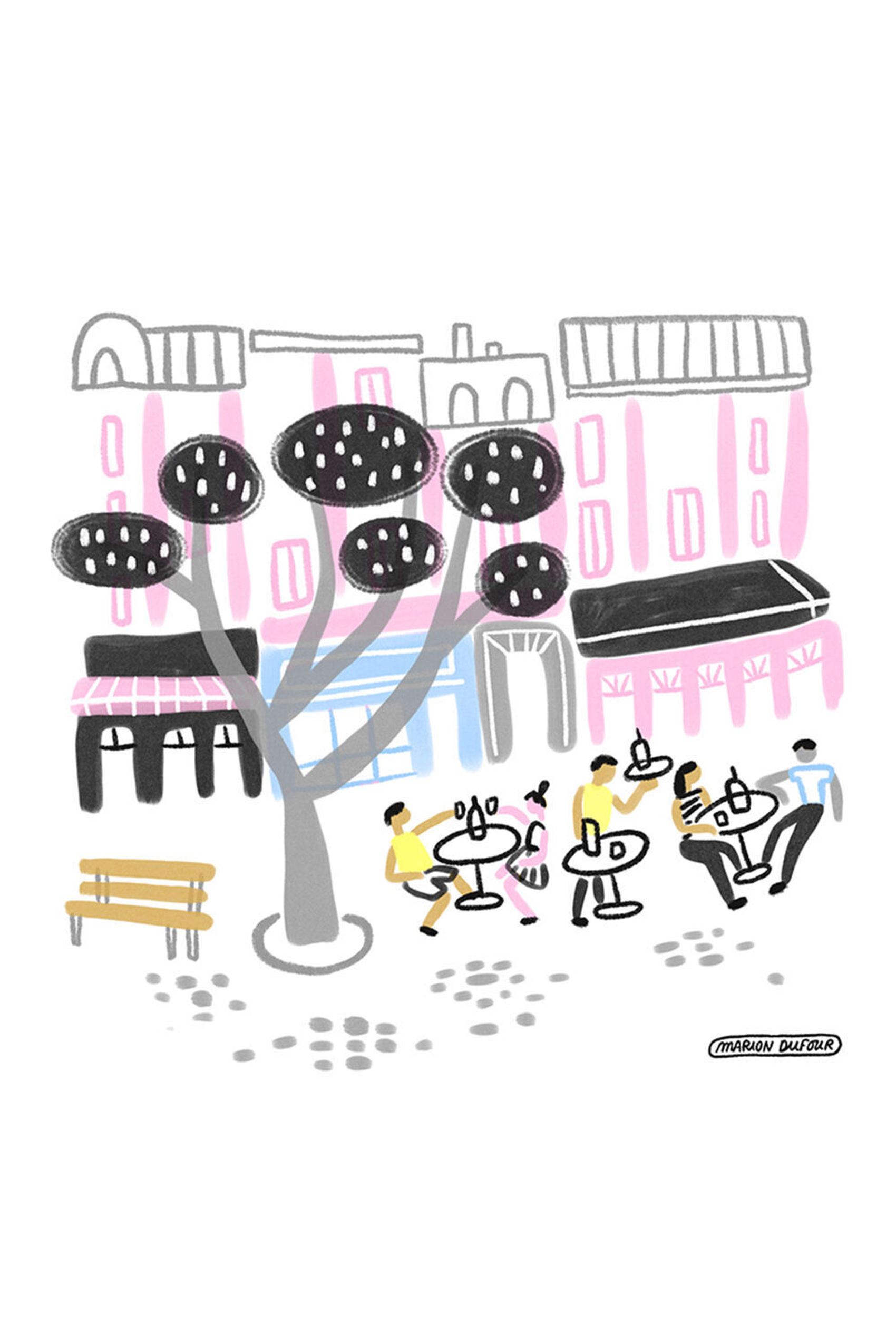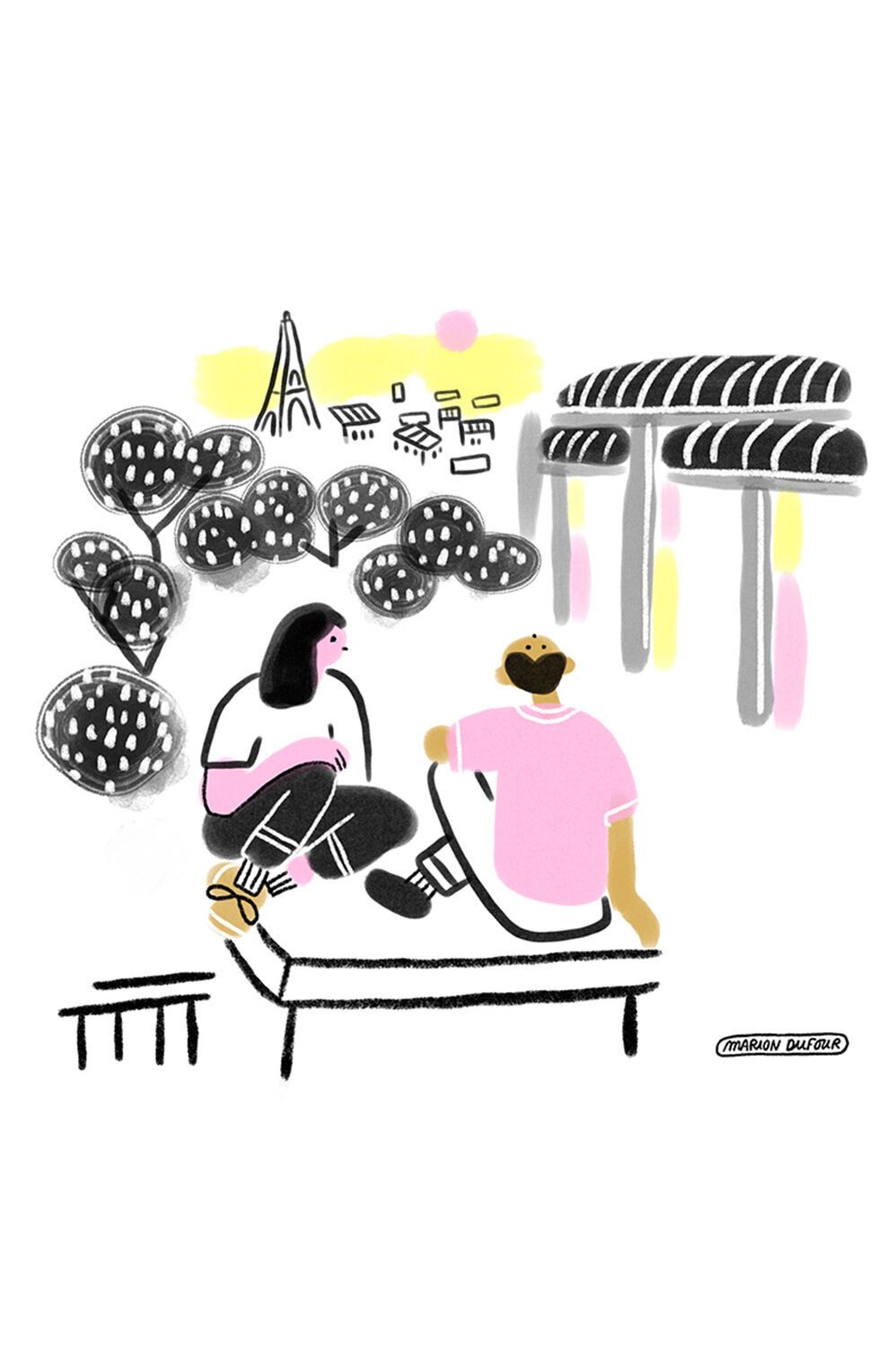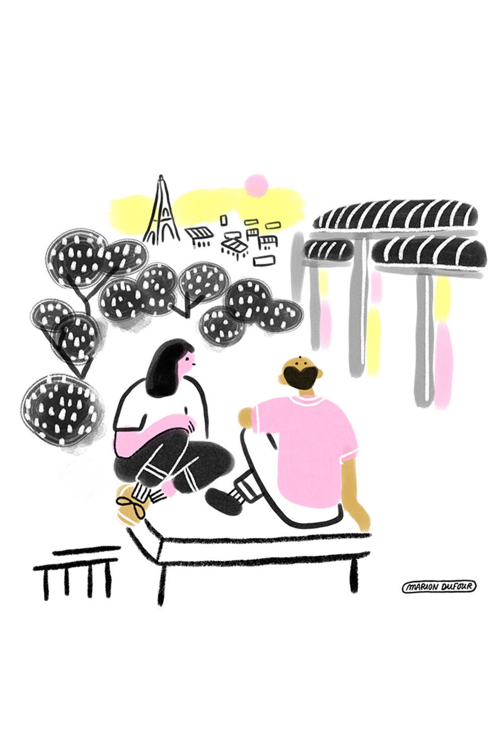 Marion Dufour lebt in Paris und ist Illustratorin sowie Grafikdesignerin. Für die Lounge und die Meetingräume in unserem Motel One Paris-Porte de Versailles hat sie eine Serie von Illustrationen entworfen: schwarz-weiß Bilder. die auf poetische und humorvolle Weise Szenen aus dem Alltag der Hauptstadt Frankreichs erzählen. Kleine typische Momente des Pariser Lebens von morgens bis abends, angefangen beim Croissant, über das Flanieren im Park bis hin zu Gesprächen beim Sonnenuntergang.
