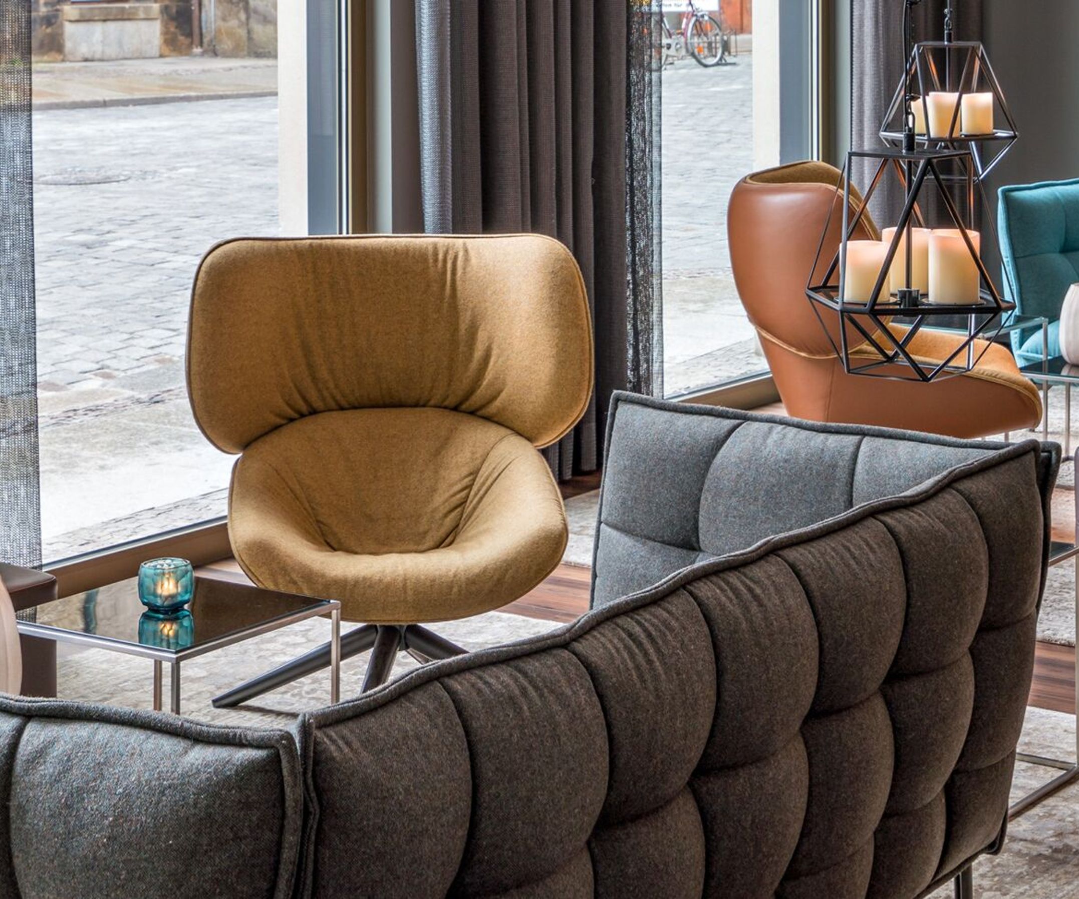 Unsere One Lounge versetzt Sie in friedliche Aufbruchsstimmung. Die LED-Banner an der Wand verkünden News aus dem Jahr 1989 und die Plakatsprüche, die Sie auf den Lamellen unserer Raumteiler entdecken können, erwecken die Montagsdemonstration wieder zum Leben. Dazu gesellen sich die Sessel „Cleo" mit und ohne Steppung von Rossin.