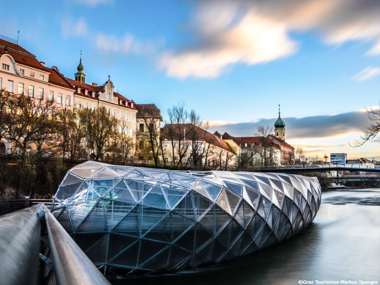 Was sich die Grazer*innen unter einer Insel vorstellen, hat wohl nichts mit dem allgemeingültigen Bild zu tun. Nur einen Katzensprung vom Kunsthaus Graz entfernt, führt die Murinsel zum Ufer der Grazer Altstadt. Die extravagante Stahlkonstruktion des New Yorker Künstlers Vito Acconci erinnert mit ihrem halbverdeckten, gedrehten Zentrum ein bisschen an eine Muschel – dabei ist sie korrekterweise eine Mischung aus Steg und Schiff. Seit 2003 ankert die Murinsel permanent im Stadtfluss und sorgt als schwimmende Plattform nicht nur für den Austausch zwischen Altstadt und Lendkai. Auf ihr lässt es sich auch wunderbar im „hauseigenen“ Café das Flussplätschern der Mur genießen oder in der Arena wechselnden Kultur-Events beiwohnen. Der Murinsel-Shop hält regionale Köstlichkeiten aus der Steiermark bereit oder außergewöhnliche Mitbringsel von Grazer Designer*innen.