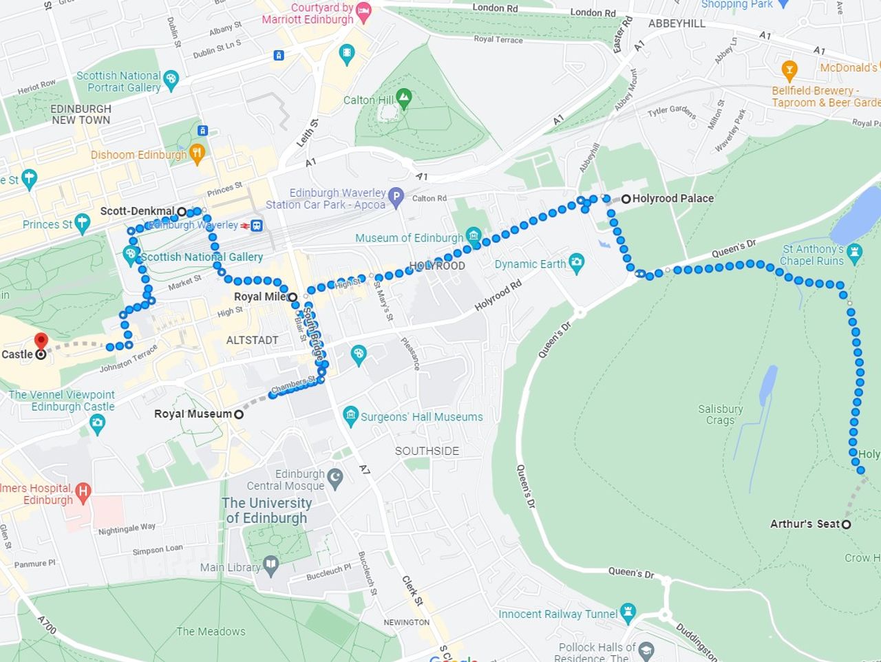 Beginnen Sie am Arthur's Seat: der alte Vulkan - ja, Sie lesen richtig! - der 251 Meter über dem Meeresspiegel liegt, ist die einzige Möglichkeit, Edinburgh in all seiner ganzen Pracht zu begutachten. Vom Arthur's Seat führt Sie der Weg an den alten Ruinen der St. Anthony's Chapel vorbei direkt zum Palace of Holyroodhouse. Der Palast aus dem 16. Jahrhundert, dient heute noch als offizielle Residenz der britischen Monarchen in Edinburgh.