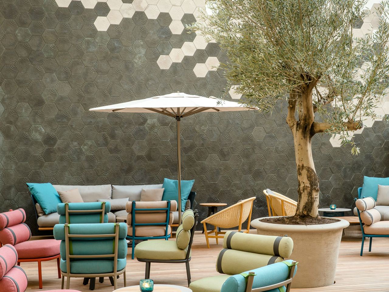Our Mediterranean patio, which also features olive and lemon trees, wouldn't be complete without these gems, which offer a truly Southern European charm – the wall tiles are originals from the architect and artist Gaudí and create a stylish backdrop while you relax on the lounge furniture by Kettal, a family-owned Spanish company.