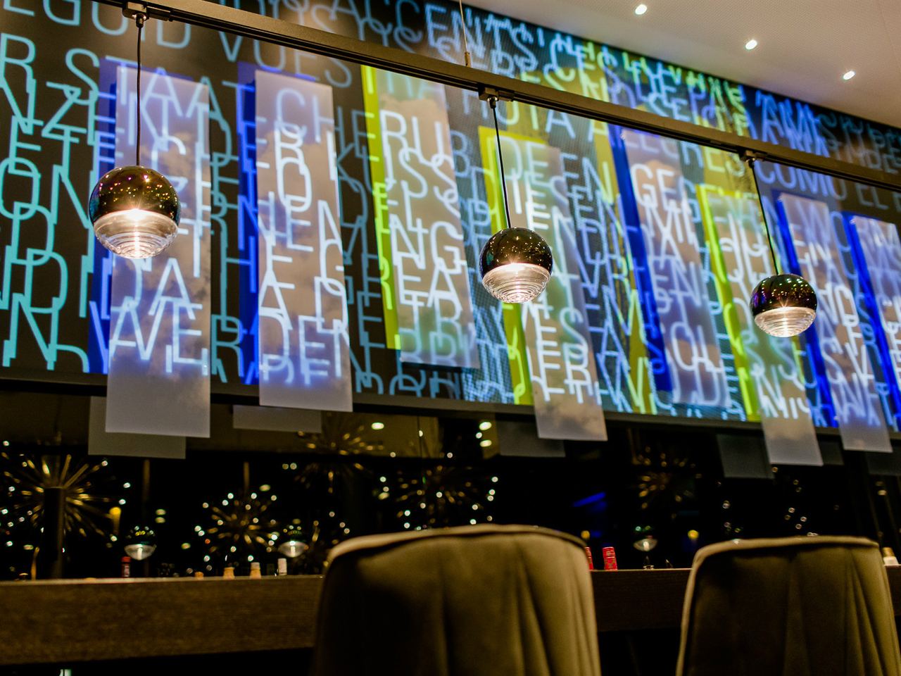 Swish, swish, swish. You can almost hear the flicking of the conductor’s baton as our design symphony begins at the reception desk. Dividing the room, your prelude is an oversized music stand that towers right up to the roof and features songbooks, sheet music and illustrated books. The ‘Götterfunken’ quote, which means ‘sparks of divinity’, comes from Friedrich Schiller’s poem ‘Ode to Joy’. It was set to music by Beethoven in his Symphony No. 9 and became a European anthem; it will hopefully spring to mind as you walk under the sparkling Cannonball pendant lamp by DelightFULL.
