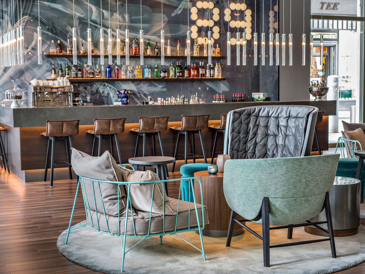 At our Bar 89 you can philosophise to your heart´s content while contemplating the images and texts that are an integral part of our interior design. If you look closely enough, you will also see the floral crown of the Peace Column replicated on our wallpaper. A collage created exclusively for Motel One. A colorful accent is added by the turquoise tubular-steel ´eu/canistro´ armchair by eumenes.