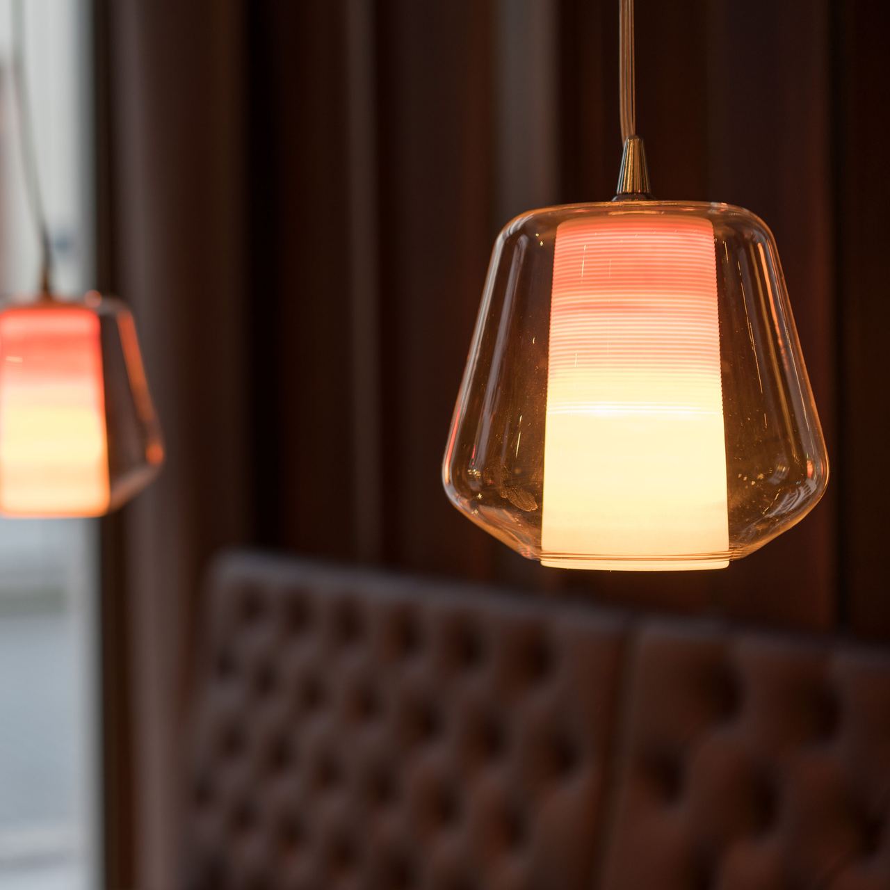 Candles have always symbolised special moments and their soft light is ubiquitous at Motel One. Glittering like a sea of light, the chandelier, which is manufactured in Tuscany by II Pezzo Mancante, hangs above the large natural stone table by Draenert. The beautifully sparkling glass shards of the chandelier's candels and the ´Etica´ Pendant Lamp by ILIDE enlighten you already during breakfast.