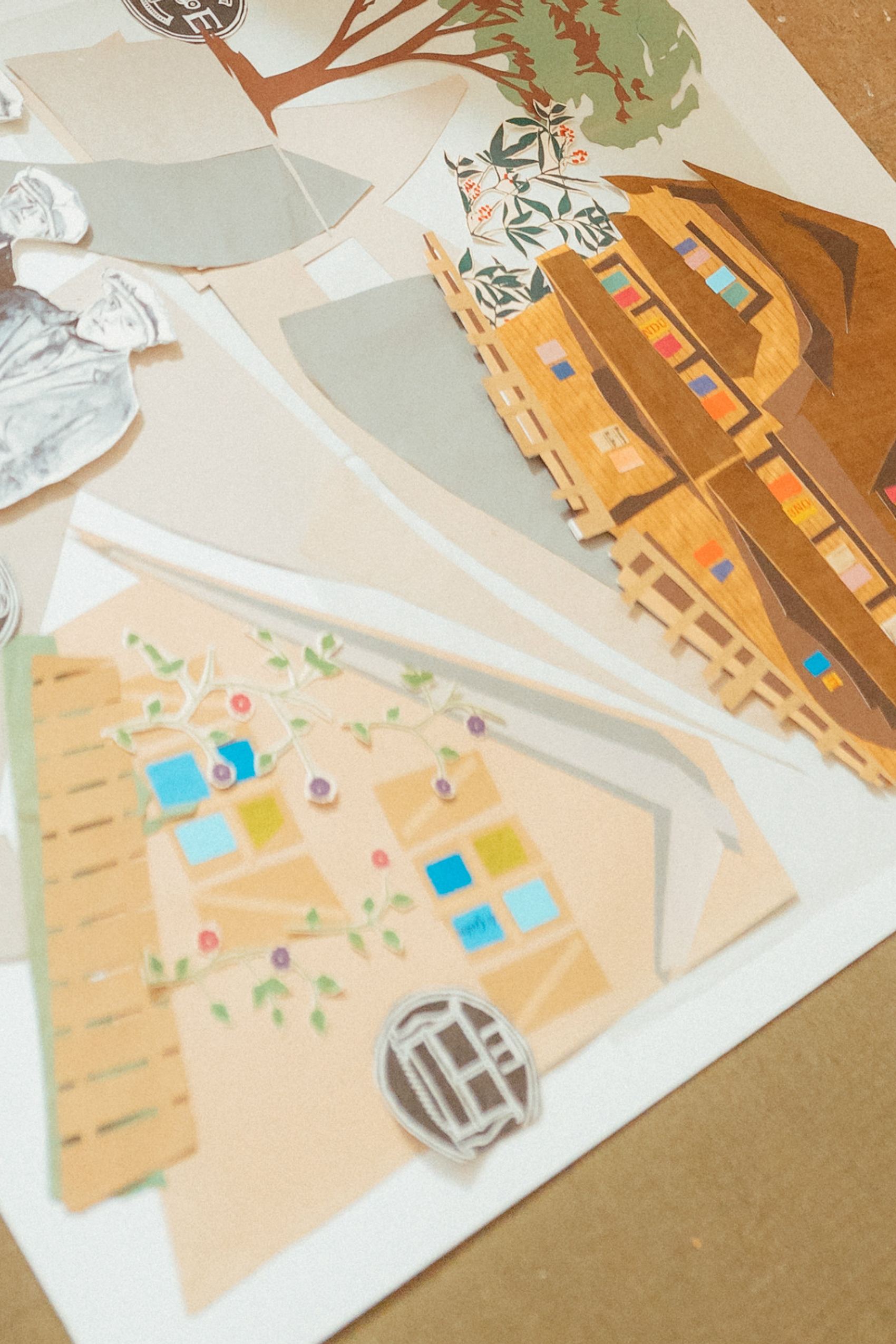 His collages at the hotel bring the neighbourhood to life. For the works, he selected seven of his favourite locations that he finds particularly inspiring. Like the Müller’sches Volksbad, for example, which was once the largest swimming pool in the world, or Wiener Platz with its little stands that remind him of French vegetable and fish markets...