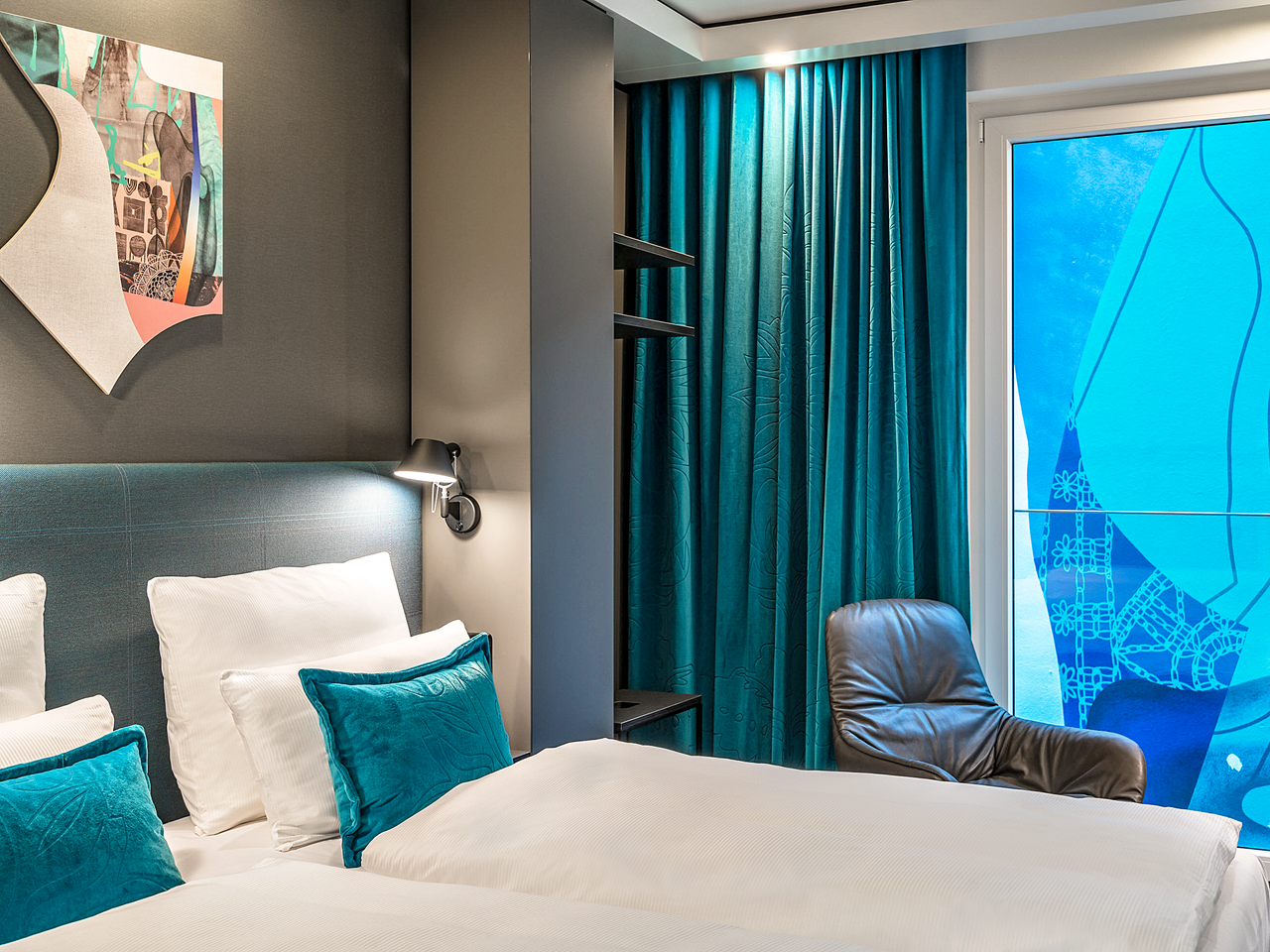 The colourful, fashion-oriented and extraordinary furnishings in the lobby perfectly embody this theme. They have been exclusively produced by the Italian label Moroso, chiefly using natural and recyclable materials. There is also unique designer furniture in the breakfast and bar area.