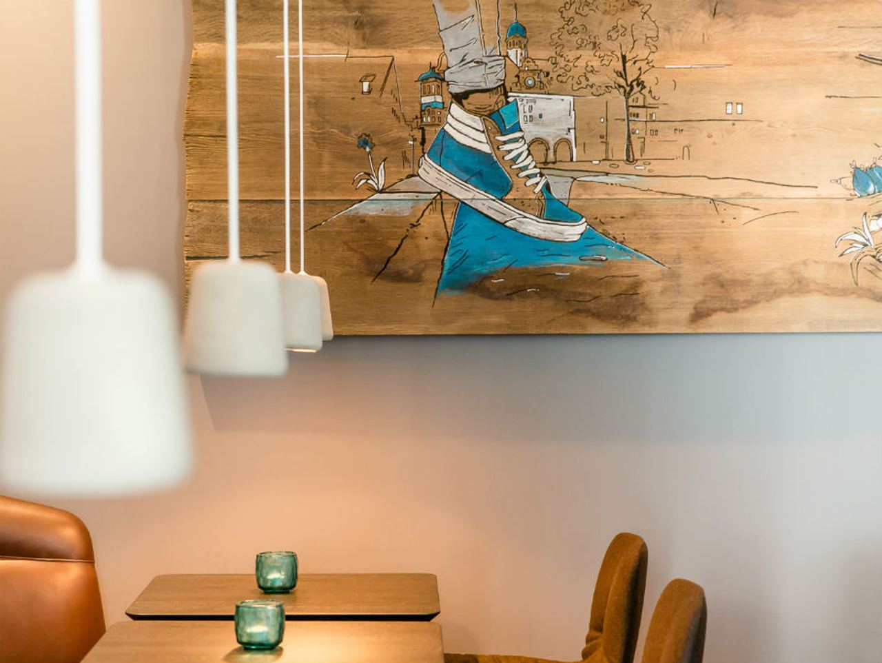 The Freiburg illustrator Tillmann Waldvogel has designed the walls of the breakfast area to inspire you to go out and explore the streets first thing in the morning.