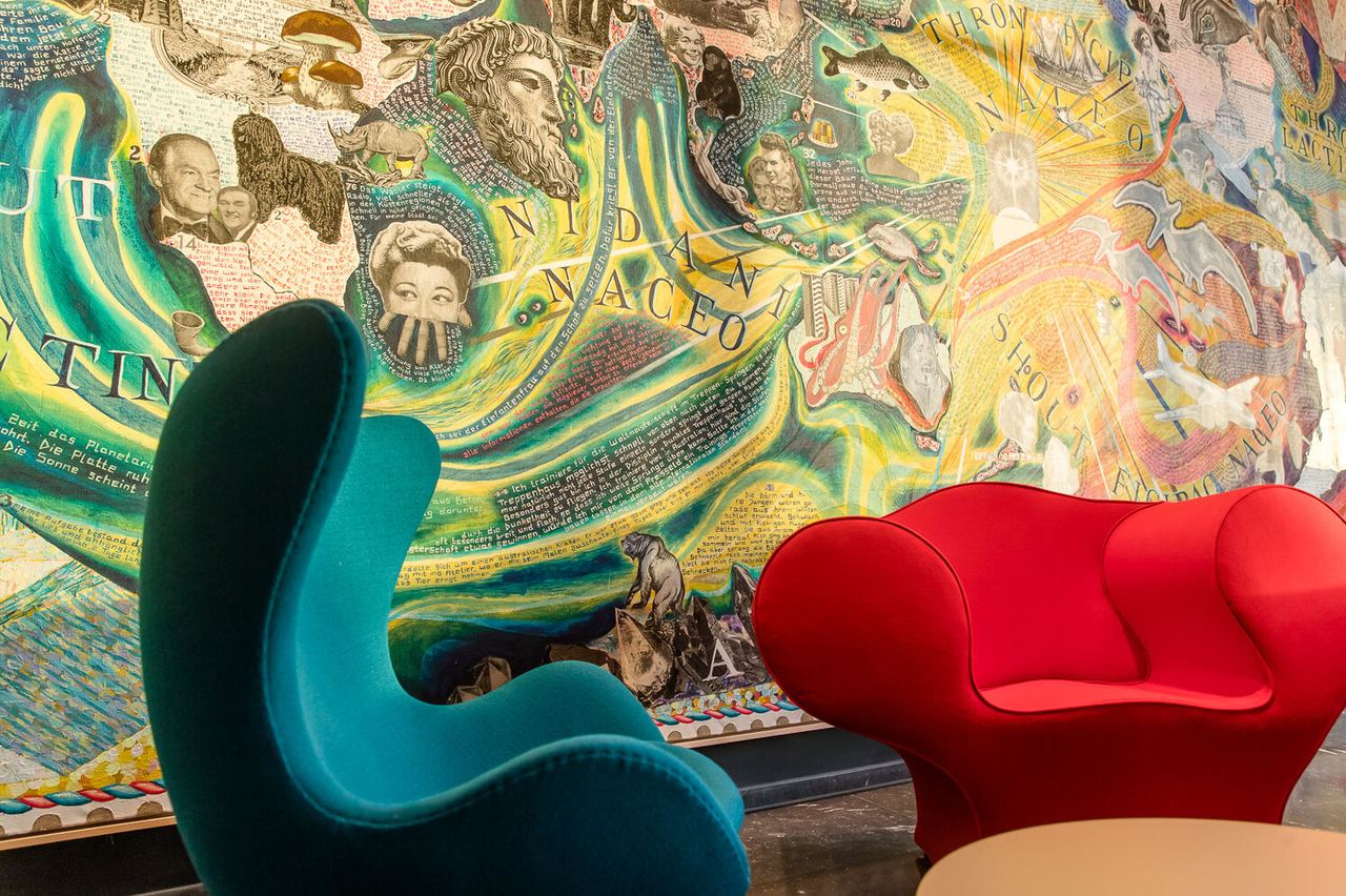 Upon entering the hotel, guests are greeted by an oversized stamp, an artwork by the artist Paule Hammer. His collage on canvas "Geträumte Weltkarte" (Map of a Dream Wordl) expertly combines painting, narrative text and individual motifs that have been used on stamps all over the world.