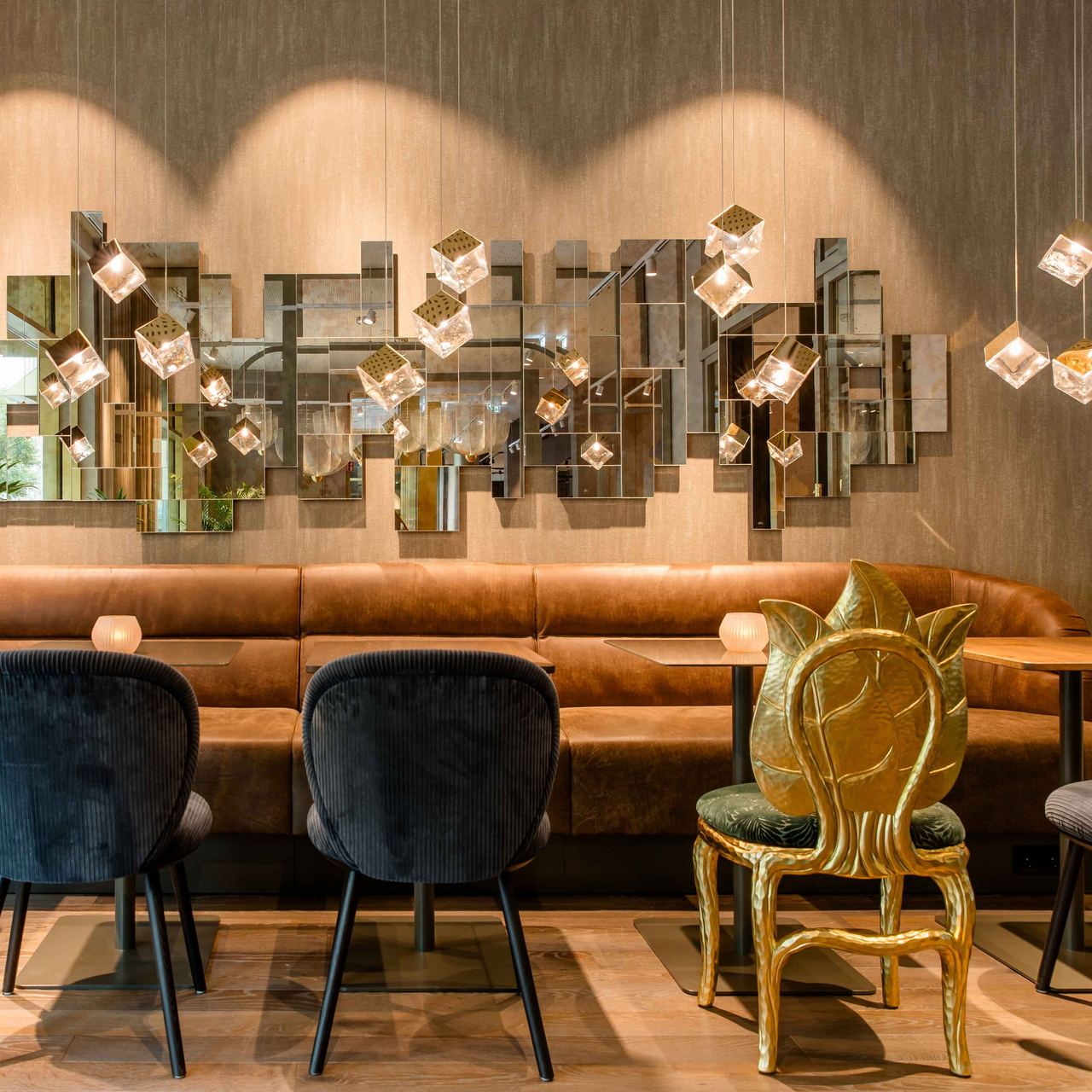…on the wall. The impressive antique mirror in the lounge will almost make you think you’re in a fairy tale – or in the Mirror Cabinet of the Residence. The shimmering gold reflections and the sumptuous Clorophilla chairs by Fratelli Boffi also evoke the splendour of their inspiration.