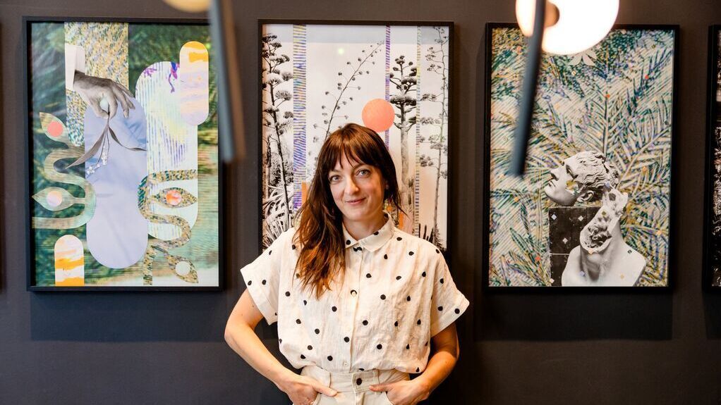 The starting point for the installation and collages was a historical woodcut of the winter garden on the roof of the residence, which I found in an antique bookshop. This artificially created paradise of the eccentric monarch was demolished shortly after his death. There he collected exotic plants and created illusionistic scenes. Digitally reworked, I used the woodcut as wallpaper behind the reception desk. Printed dichroic glass panes are mounted on it, which subtly refract and reflect the image depending on the viewing angle – a dreamlike approximation of the lost garden with its auratic distance.