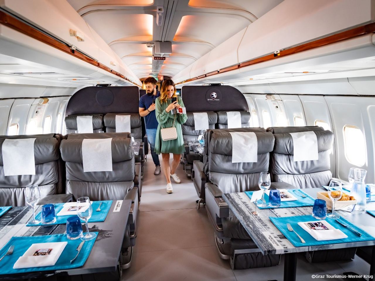 In Graz, it’s not just at the airport where you can get a glimpse of aircraft. Two disused jets have found a new home in the north of the city – where they have landed on the roof of Nova Park at an altitude of 22 meters. They not only look spectacular from the outside, but really make visitors take off. Check-in is preferred: onboard is the Boeing B-727 aircraft restaurant, where you can enjoy high-altitude flights without any turbulence.