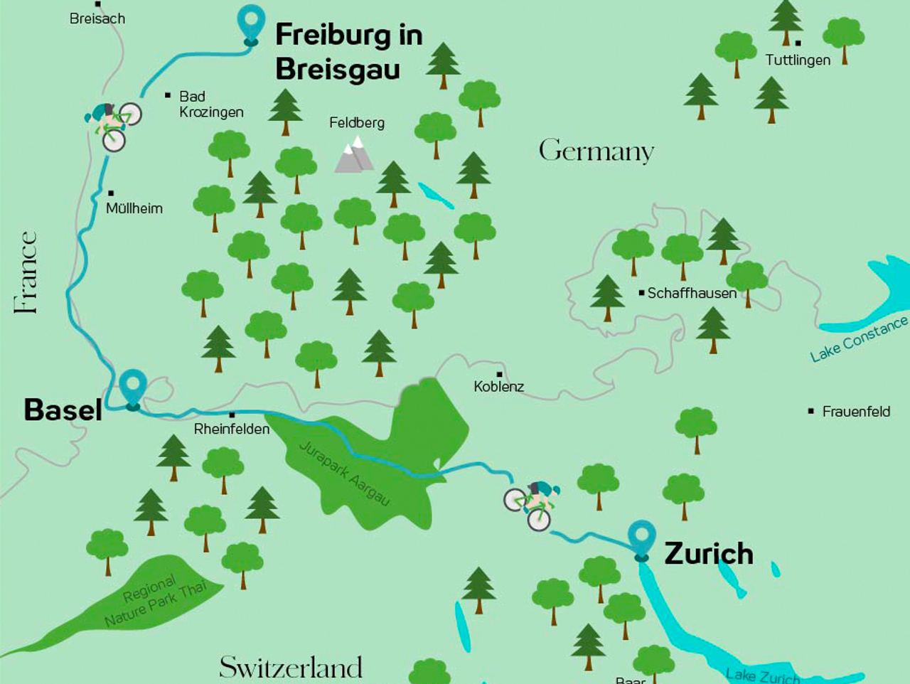 You can travel from Freiburg to Basel via the ‘Südschwarzwald-Radweg’ cycle trail. If you only want to travel as far as Basel, you can cycle this route as a seven-day circular trail. If you’d like to continue from Basel to Zurich, we recommend cycling straight there. On this route, you’ll cover 70 kilometres in one day, stopping in Badenweiler or Müllheim, and possibly taking a detour to visit the ‘Isteiner Klotz’ rock in the district of Lörrach. If you have a bit more time, you can also plan other stops or detours for your road trip between Freiburg and Basel.