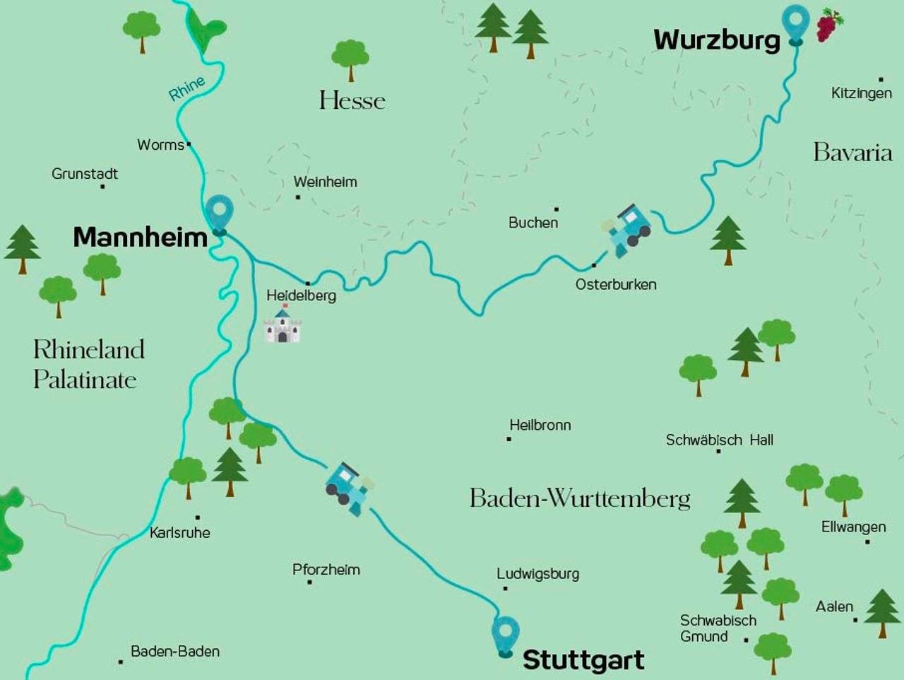 If you feel like taking a more leisurely pace, make a stop in Heidelberg en route. This romantic city surrounded by vineyards and imposing castle ruins is well worth a visit.