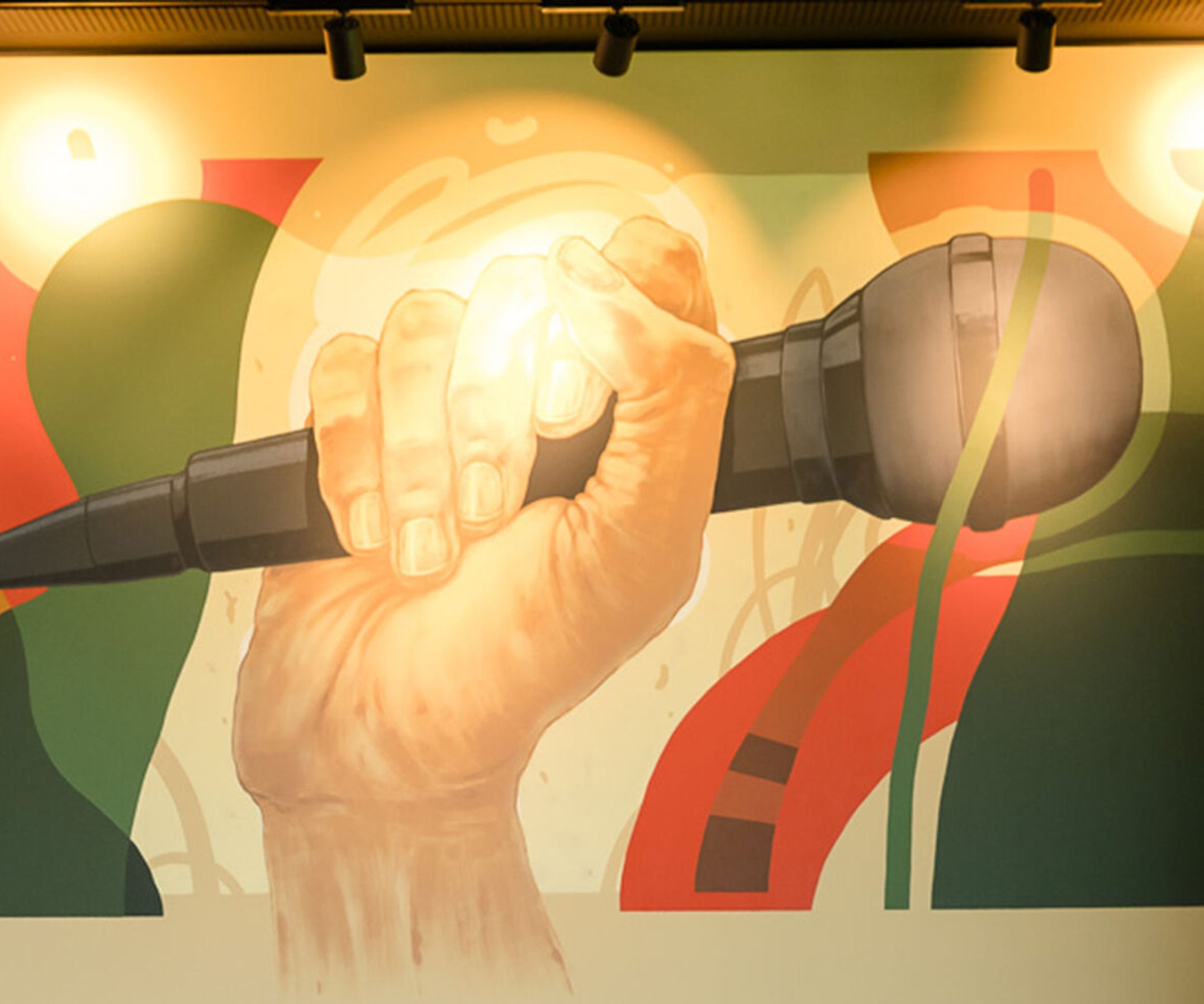 Next to the reception, street artist Czolk shows that the music scene in Mannheim is not only rich in tradition, but hast also mastered the transition to modernity. The black and white graffiti with yellow accents captures the pulsating energy of the city and its creative diversity.