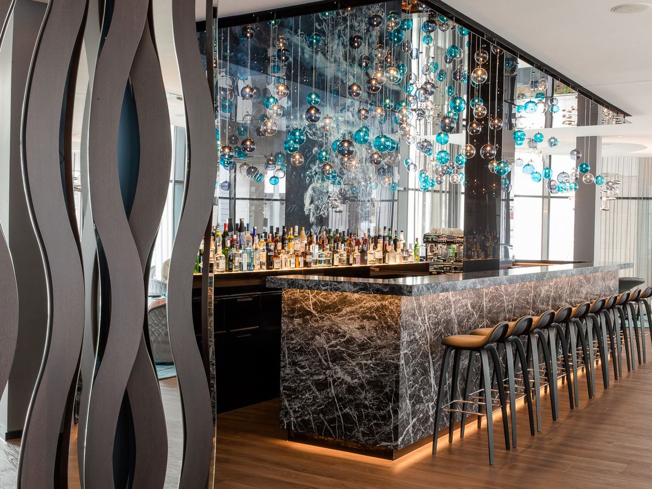 Speaking of highlights: The light installation made especially for Motel One Stuttgart-Bad Cannstatt above the huge natural stone bar consists of an array of ‘Bulls’ lamps by Reflex, floating like air bubbles through water. Feel free to exchange the latter here for a G&T!