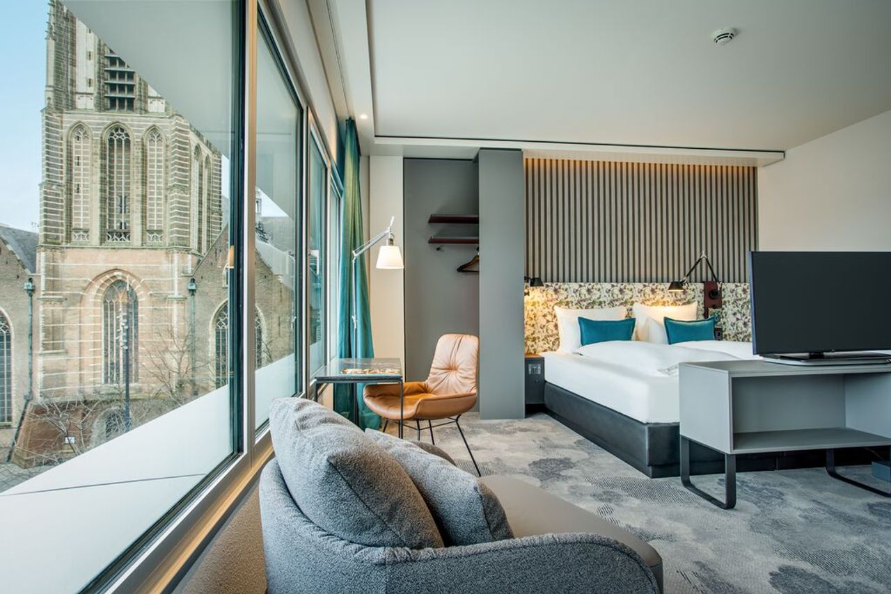 On one side the modern market hall on the other the Laurenskerk: our Motel One in Rotterdam is surrounded by city hotspots. Here we chose the view of the Gothic church, the only remnant from the Middle Ages.