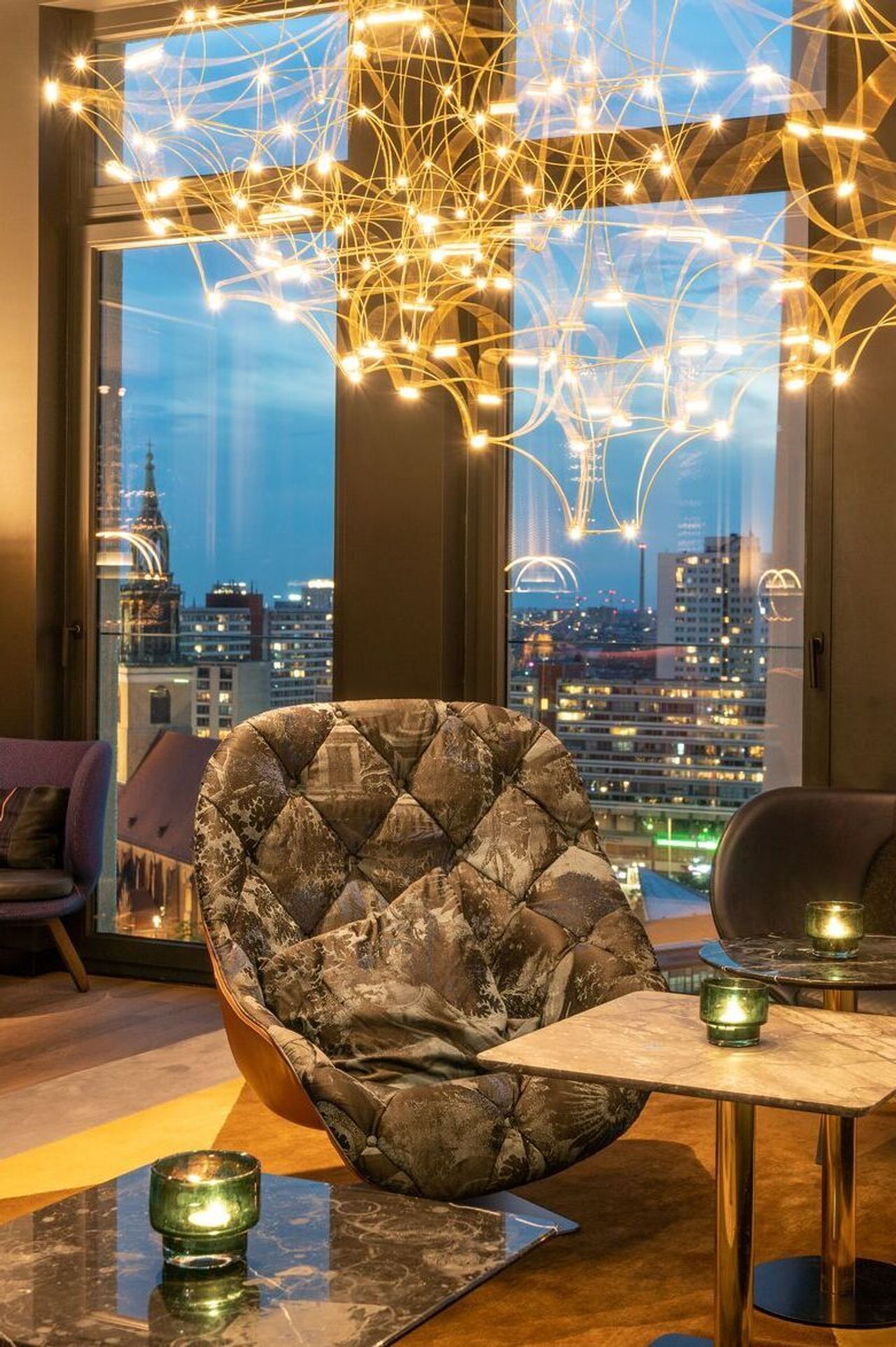 EL DISEÑO: ¡Es un auténtico foco de atracción! Nuestro bar se presta al esplendor y el glamour de la ciudad cinematográfica de Berlín, aunque brilla con superficies doradas, cristales y espejos durante todo el año, y ¡no solo para la Berlinale! Descubre tus propias cualidades como estrella de cine en la terraza de la azotea cuando brindes por el feliz final de un exitoso día en una de las sillas de director.