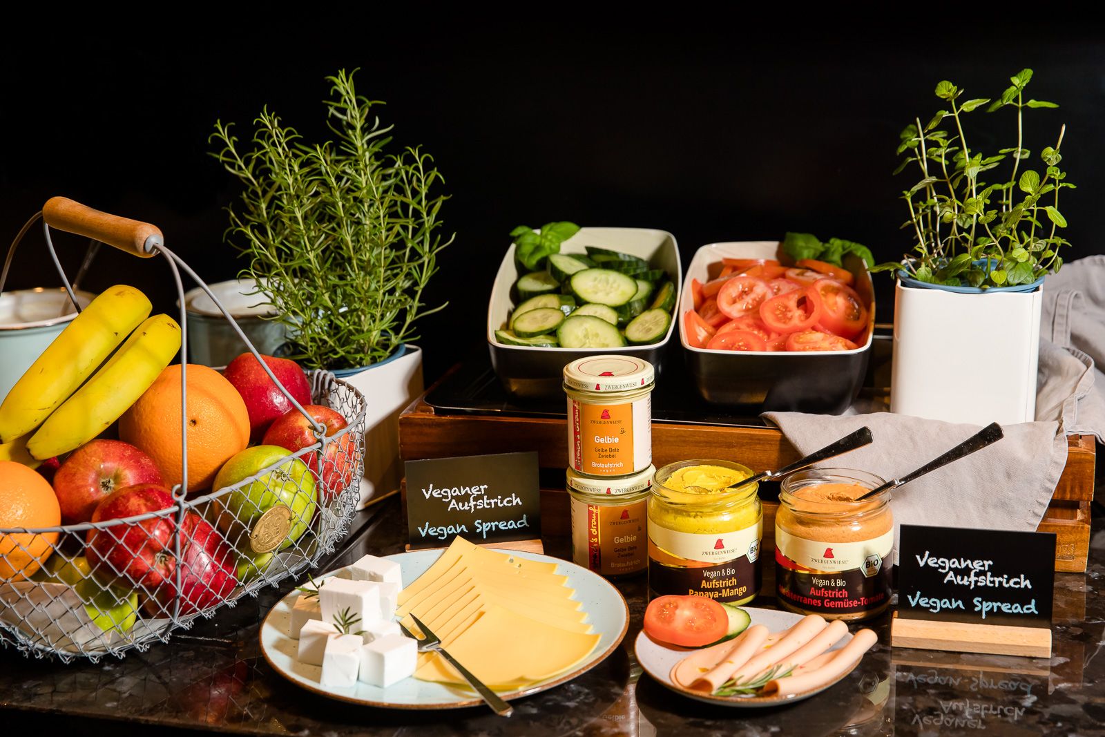 Para todos los clientes que valoran la alimentación a base de plantas, ahora tenemos aún más que ofrecerles: Además de la ensalada de frutas, los copos de maíz y el muesli de frutos secos y cereales originales, los «dulceros» pueden disfrutar de su pan de centeno ecológico vegano y sus panecillos ecológicos con la crema untable de nueces y praliné de la marca bionella, sin olvidarnos de nuestras mermeladas selectas, o de nuestros desayunos salados con cremas veganas para untar de la marca ecológica Zwergenwiese del norte de Alemania. Claro está, todos nuestros productos veganos están identificados con la correspondiente etiqueta.