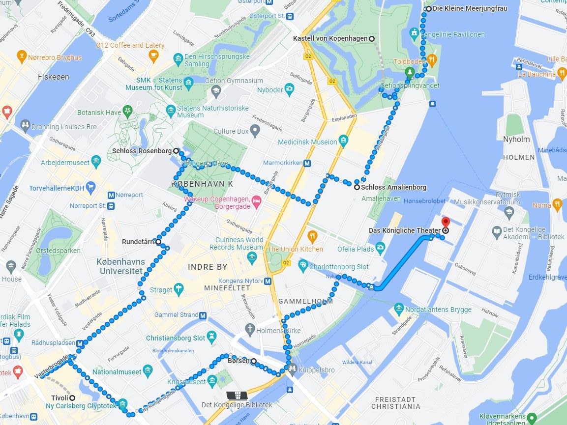 Con los pies otra vez en tierra firme podemos continuar con nuestro paseo. Nos dirigimos a una de las primeras bolsas de valores de Europa: Børsen. De camino pasará por el mundialmente conocido parque de atracciones Tivoli. El segundo parque de atracciones más antiguo del mundo ofrece una colorida variedad de atracciones y, sin duda alguna, merece la pena visitarlo. Nuestra ruta culmina con el Teatro Real, donde miles de espectadores acuden cada año para disfrutar de obras de teatro, óperas, actuaciones de ballet y conciertos. ¿Tiene ganas de disfrutar de un gran espectáculo? Puede consultar el programa aquí.