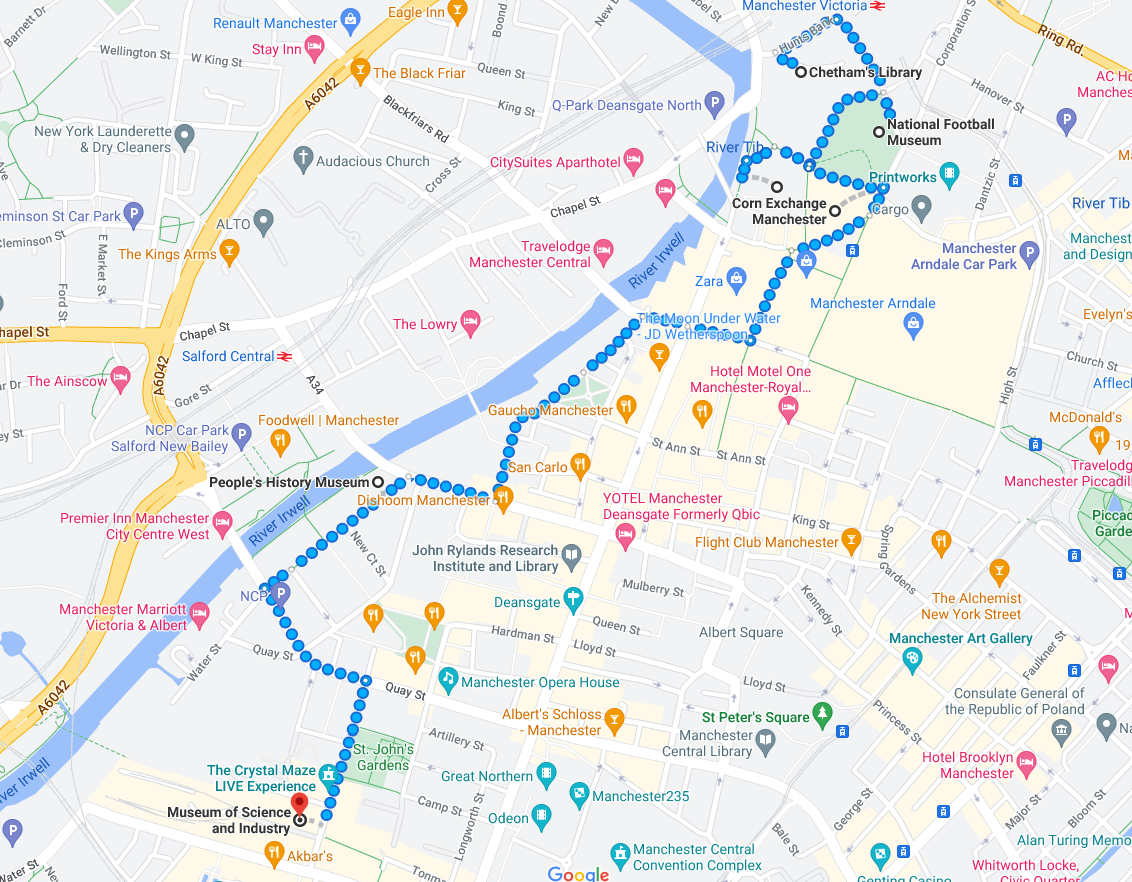 Comenzaremos en la Chetham's Library, la biblioteca pública más antigua del mundo anglosajón, cuyo origen data del año 1451. Si tiene tiempo y le apetece, puede reservar una visita guiada, que será una experiencia única —y no solo para los ratones de biblioteca—. Si prefiere comprobar sus conocimientos o sus habilidades de fútbol, el National Football Museum tiene que ser su próxima parada. La colección del museo de fútbol alberga aproximadamente 140 000 objetos, que van desde objetos históricos relacionados con el fútbol hasta instalaciones interactivas. El propio edificio, el «Urbi», fue diseñado por el arquitecto británico Ian Simpson y es un punto de interés en sí mismo. Nuestra ruta sigue el curso del río Irwell, pasando por la impresionante Catedral de Mánchestery el animado Corn Exchange, y llega directamente al corazón de Mánchester, donde le espera el People's History Museum con un paseo diferente, esta vez por la civilización humana, desde sus orígenes hasta la actualidad. Última parada: el Manchester Science and Industry Museum. Su interior es tan fascinante como entretenido y por fuera es prácticamente un emblema de la ciudad que combina a la perfección la arquitectura histórica con el diseño moderno.